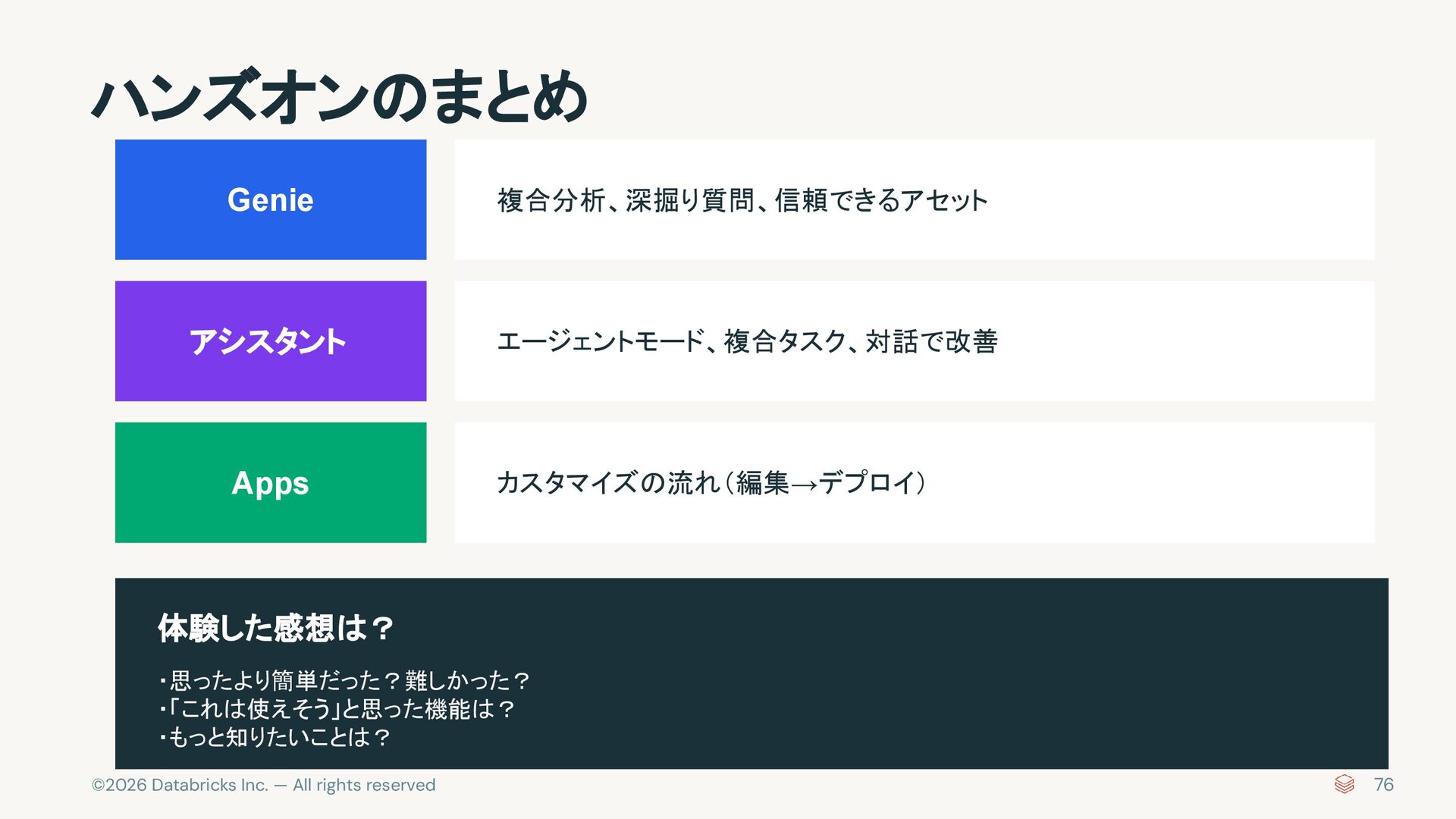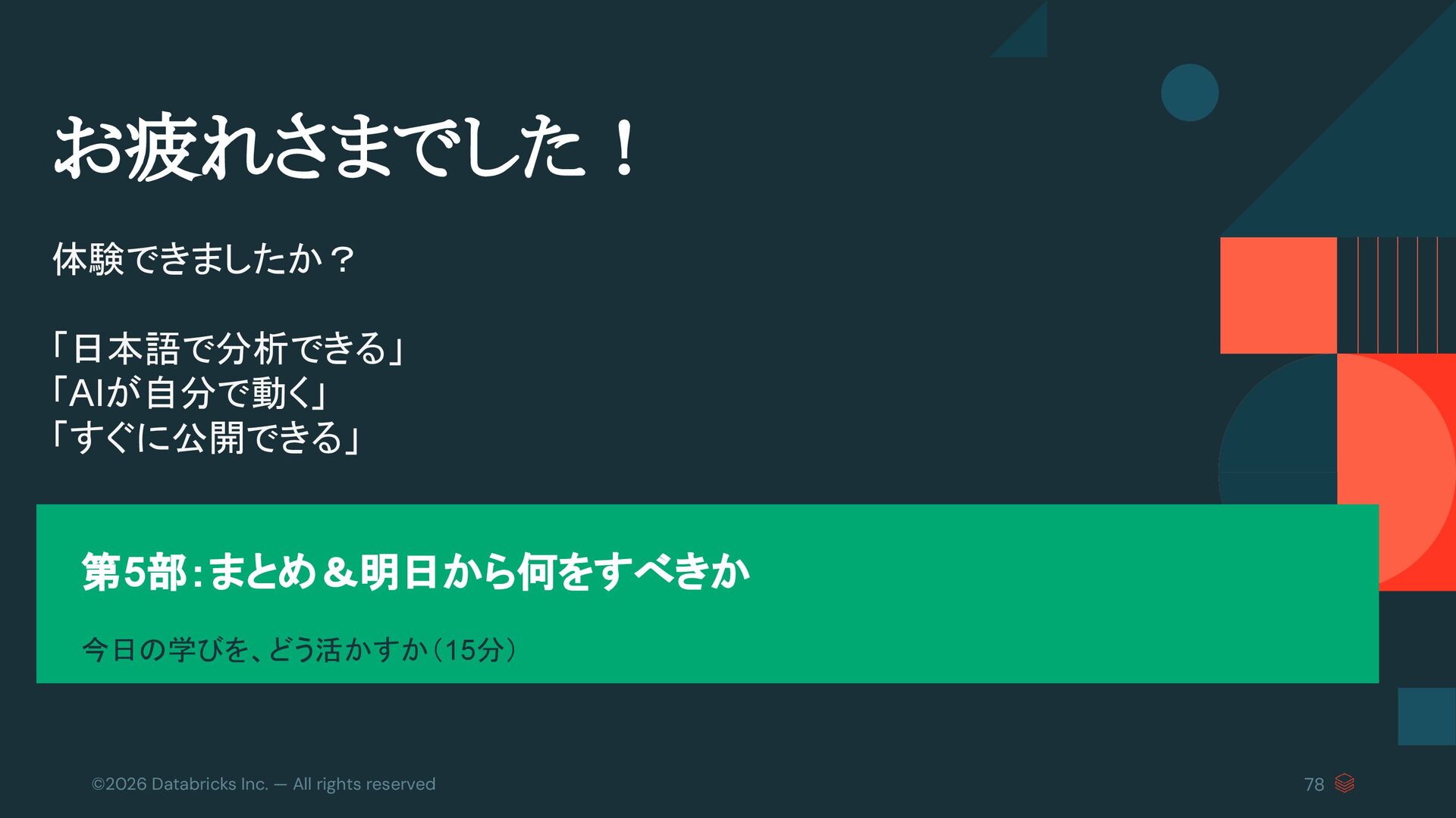 ©2026 Databricks Inc. — All rights reserved 78 お疲れさまでした! 体験できましたか?