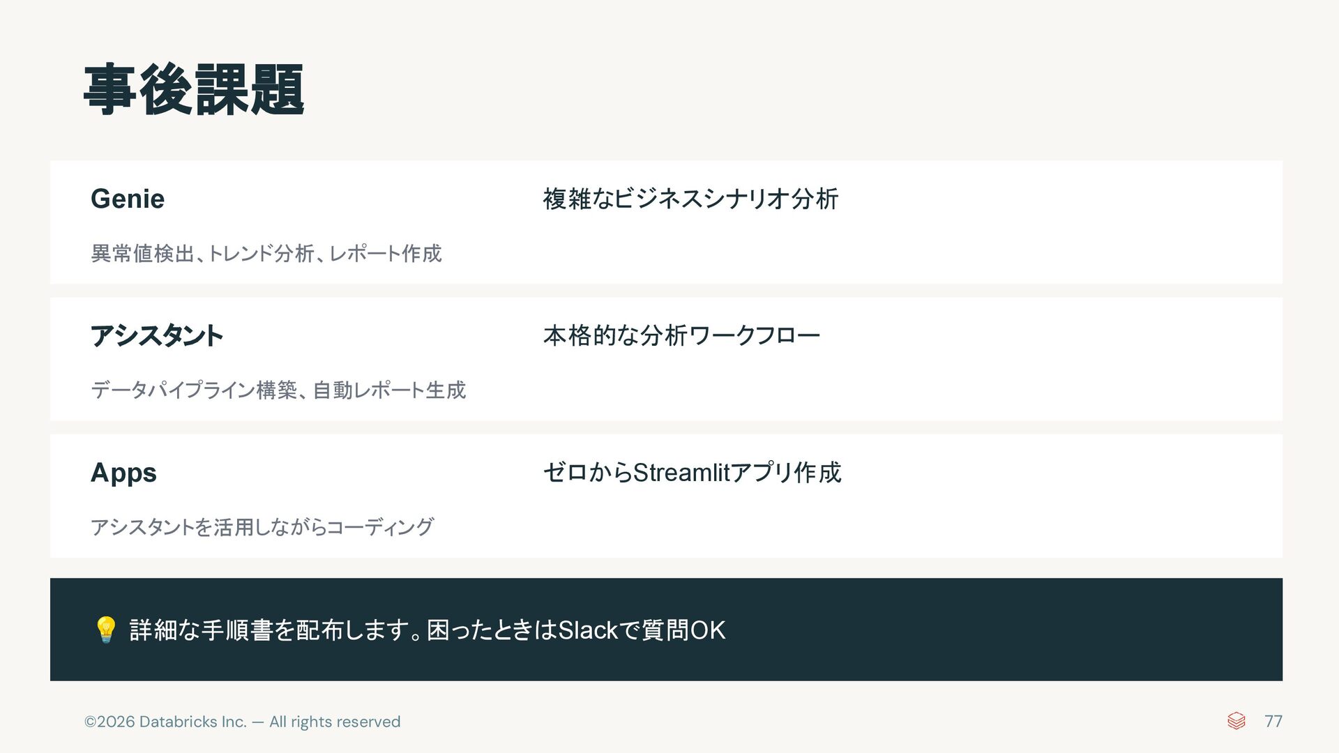 ©2026 Databricks Inc. — All rights reserved 事後課題 77 Genie