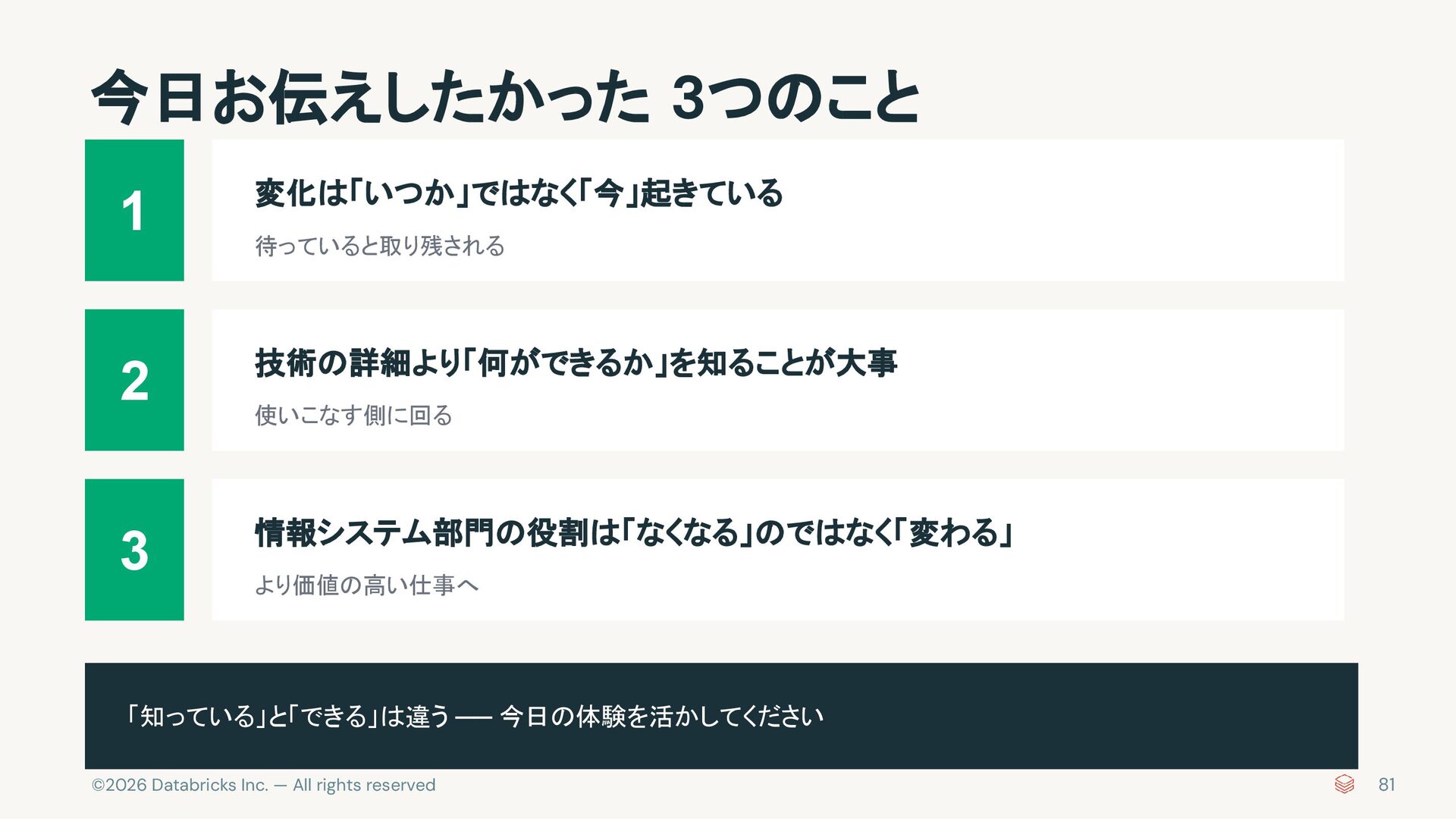©2026 Databricks Inc. — All rights reserved 今日お伝えしたかった 3つのこと 81