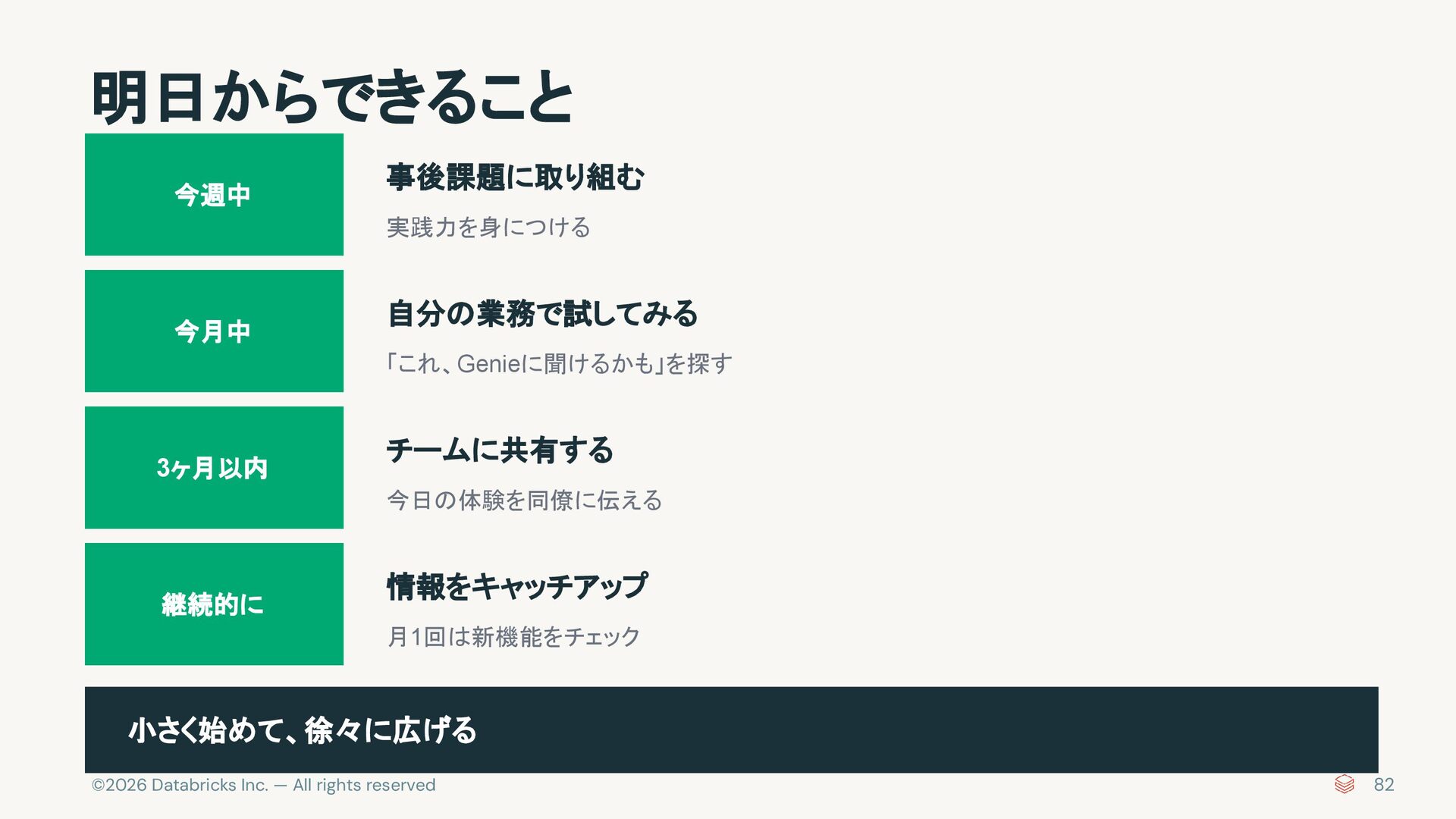 ©2026 Databricks Inc. — All rights reserved 明日からできること 82 今週中