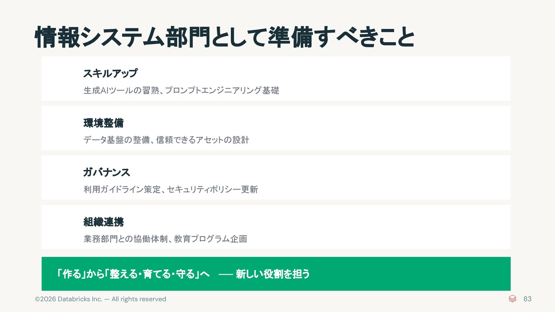 ©2026 Databricks Inc. — All rights reserved 情報システム部門として準備すべきこと 83 スキルアップ