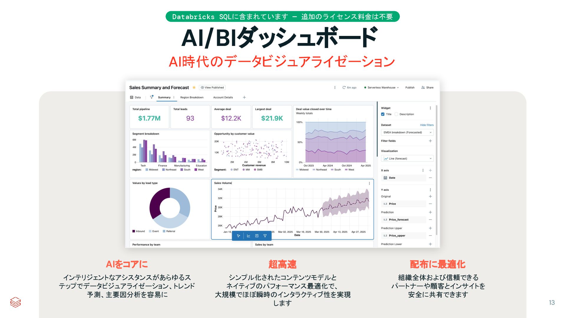 Databricks SQLに含まれています — 追加のライセンス料金は不要 AI/BIダッシュボード AI時代のデータビジュアライゼーション AIをコアに インテリジェントなアシスタンスがあらゆるス テップでデータビジュアライゼーション、トレンド 予測、主要因分析を容易に