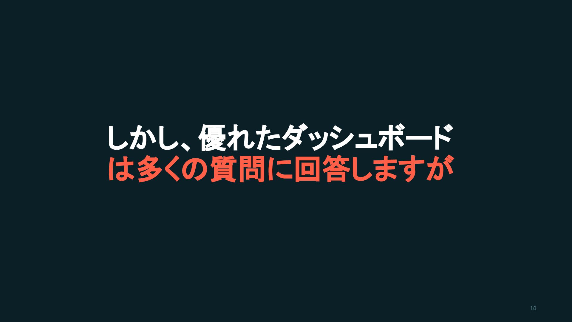 フローの中にとどまる 画面を離れてコンテキストを失うことなく、 表示されている内容に基づいて質問し、 回答を得ることができます。 「もし〜なら」と「なぜ」を解明 過去のトレンドに基づいて予測し、 観察された増減の主要因を特定。 フィードバックループを短縮 ダッシュボードのコンテンツの ギャップを自分で埋め、1回の