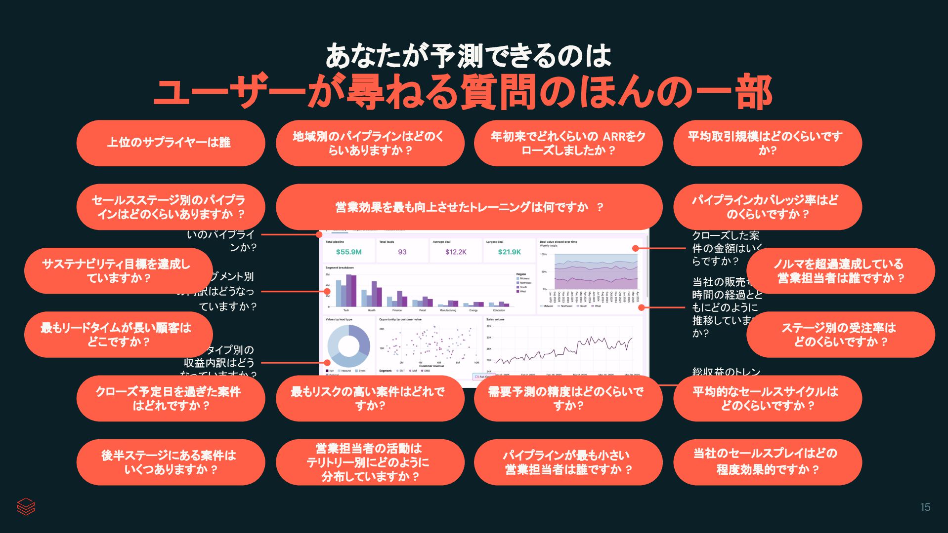 ますか? 合計でどのくら いのパイプライ ンか? 顧客セグメント別 の内訳はどうなっ ていますか ? リードタイプ別の 収益内訳はどう なっていますか ? あなたが予測できるのは ユーザーが尋ねる質問のほんの一部 上位のサプライヤーは誰 地域別のパイプラインはどのく らいありますか ? 年初来でどれくらいの ARRをク ローズしましたか ? 平均取引規模はどのくらいです か? セールスステージ別のパイプラ インはどのくらいありますか ? パイプラインカバレッジ率はど のくらいですか ? クローズ予定日を過ぎた案件 はどれですか ? 最もリスクの高い案件はどれで すか? 需要予測の精度はどのくらいで すか? 平均的なセールスサイクルは どのくらいですか ? 後半ステージにある案件は いくつありますか ? 営業担当者の活動は テリトリー別にどのように 分布していますか ? パイプラインが最も小さい 営業担当者は誰ですか ? 当社のセールスプレイはどの 程度効果的ですか ? サステナビリティ目標を達成し ていますか ? 最もリードタイムが長い顧客は どこですか ? ノルマを超過達成している 営業担当者は誰ですか ? ステージ別の受注率は どのくらいですか ? 営業効果を最も向上させたトレーニングは何ですか ? 15