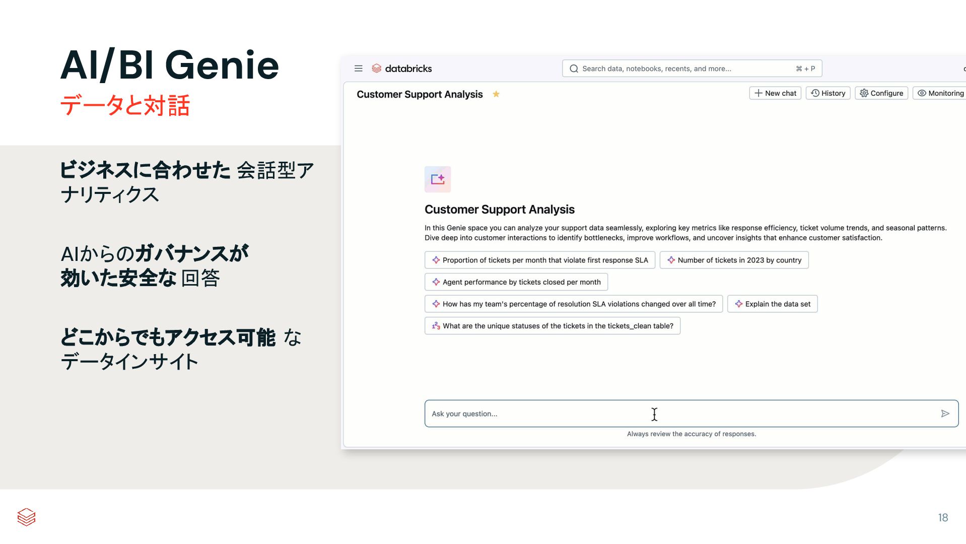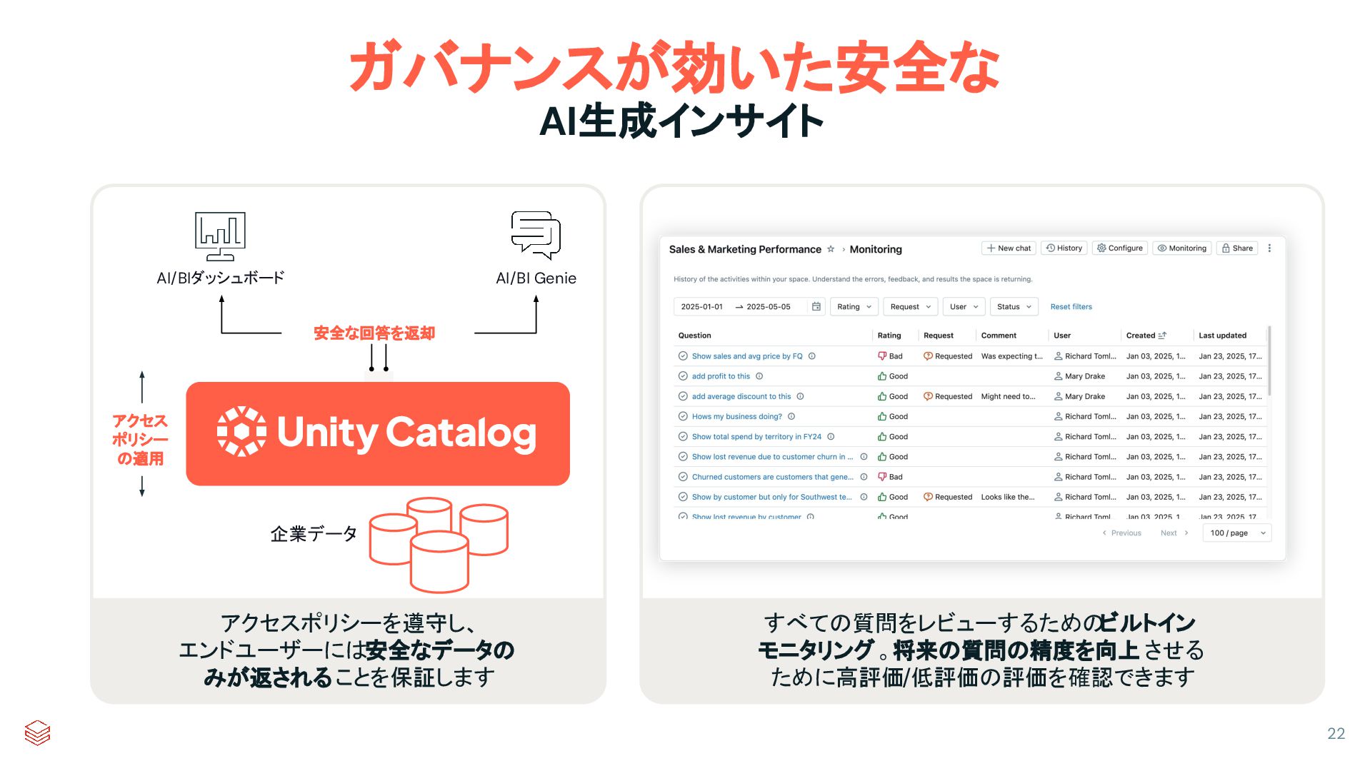 AI/BIダッシュボード AI/BI Genie 安全な回答を返却 企業データ アクセス ポリシー の適用 すべての質問をレビューするための ビルトイン