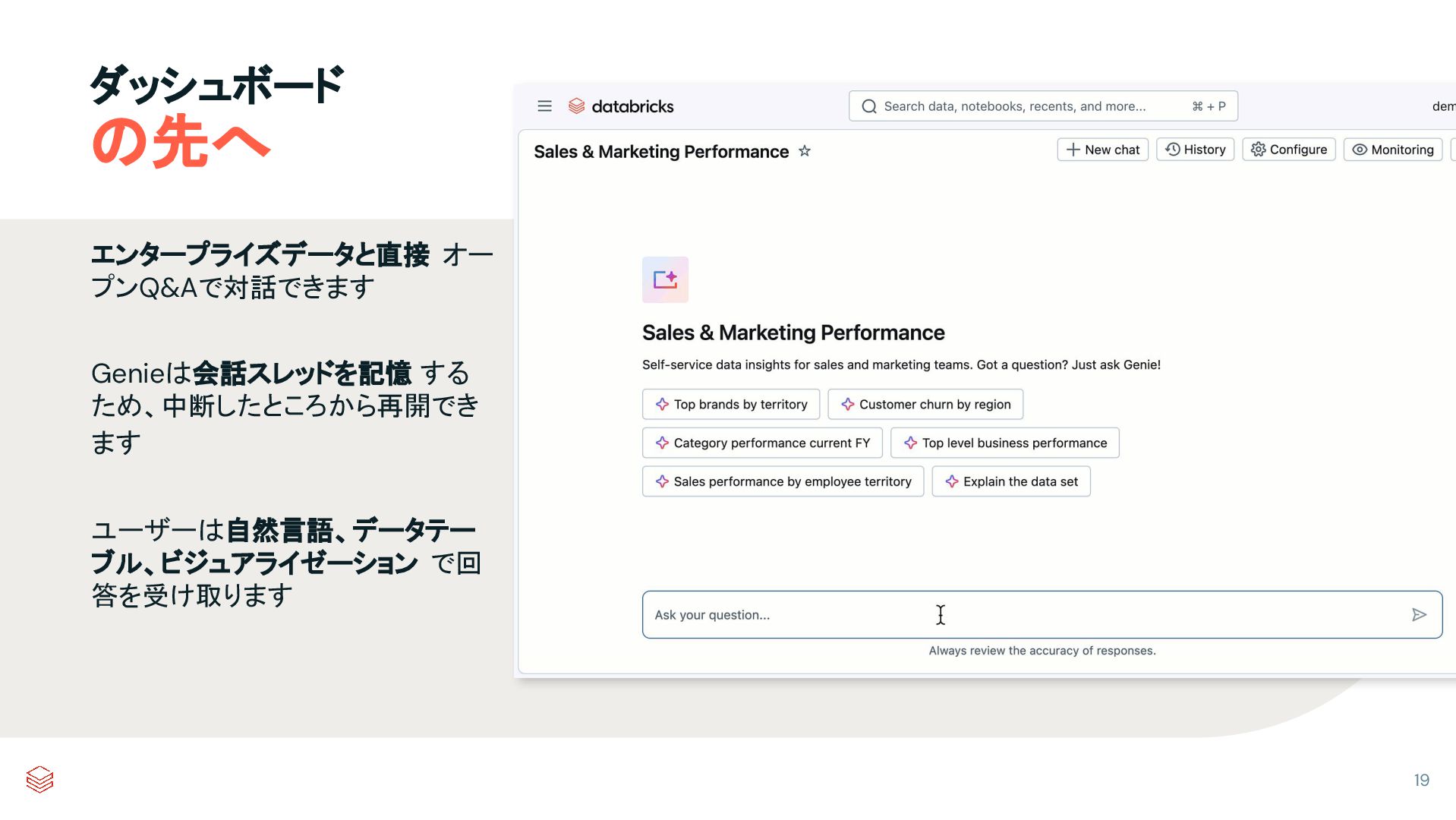 エンタープライズデータと直接 オー プンQ&Aで対話できます Genieは会話スレッドを記憶 する ため、中断したところから再開でき ます ユーザーは自然言語、データテー ブル、ビジュアライゼーション で回