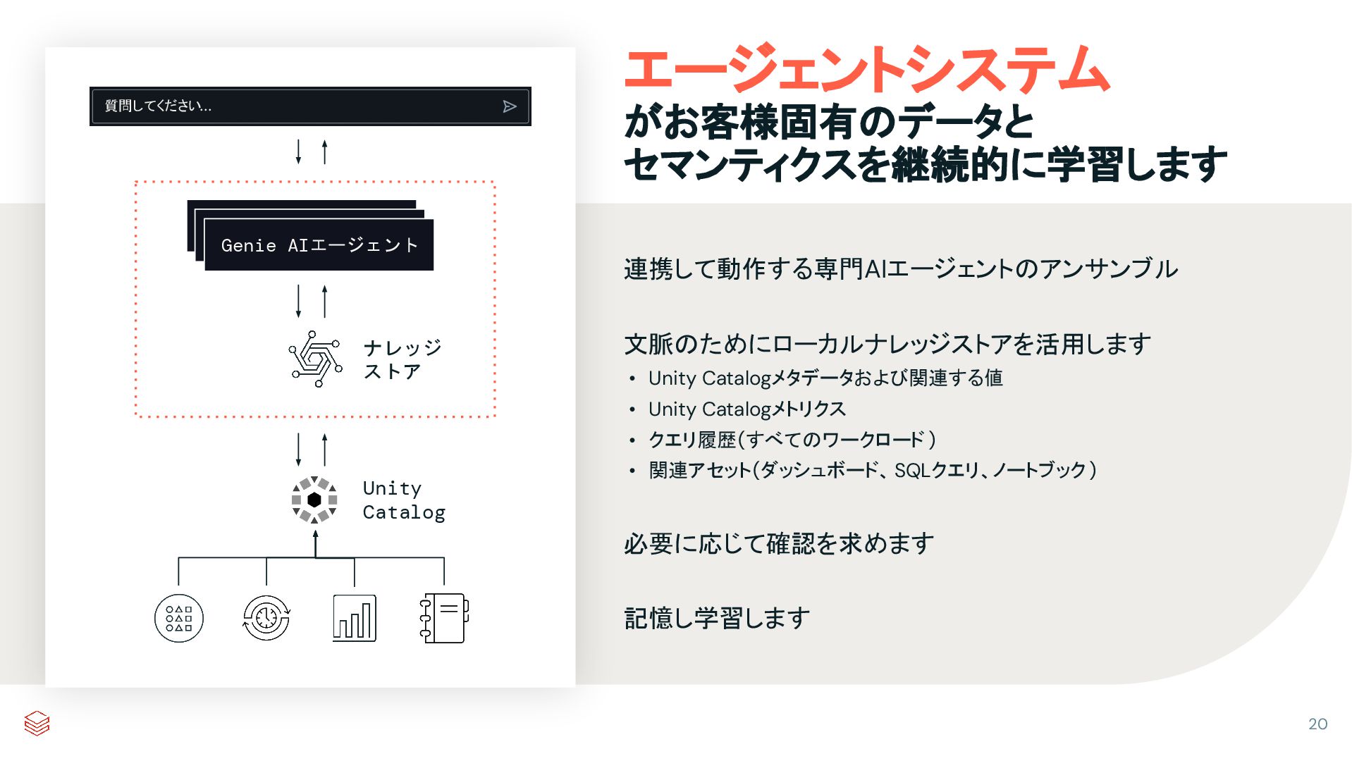 Unity Catalogメタデータおよび関連する値 • Unity Catalogメトリクス • クエリ履歴(すべてのワークロード ) • 関連アセット(ダッシュボード、SQLクエリ、ノートブック) 記憶し学習します 質問してください… ナレッジ ストア Unity Catalog エージェントシステム がお客様固有のデータと セマンティクスを継続的に学習します 20