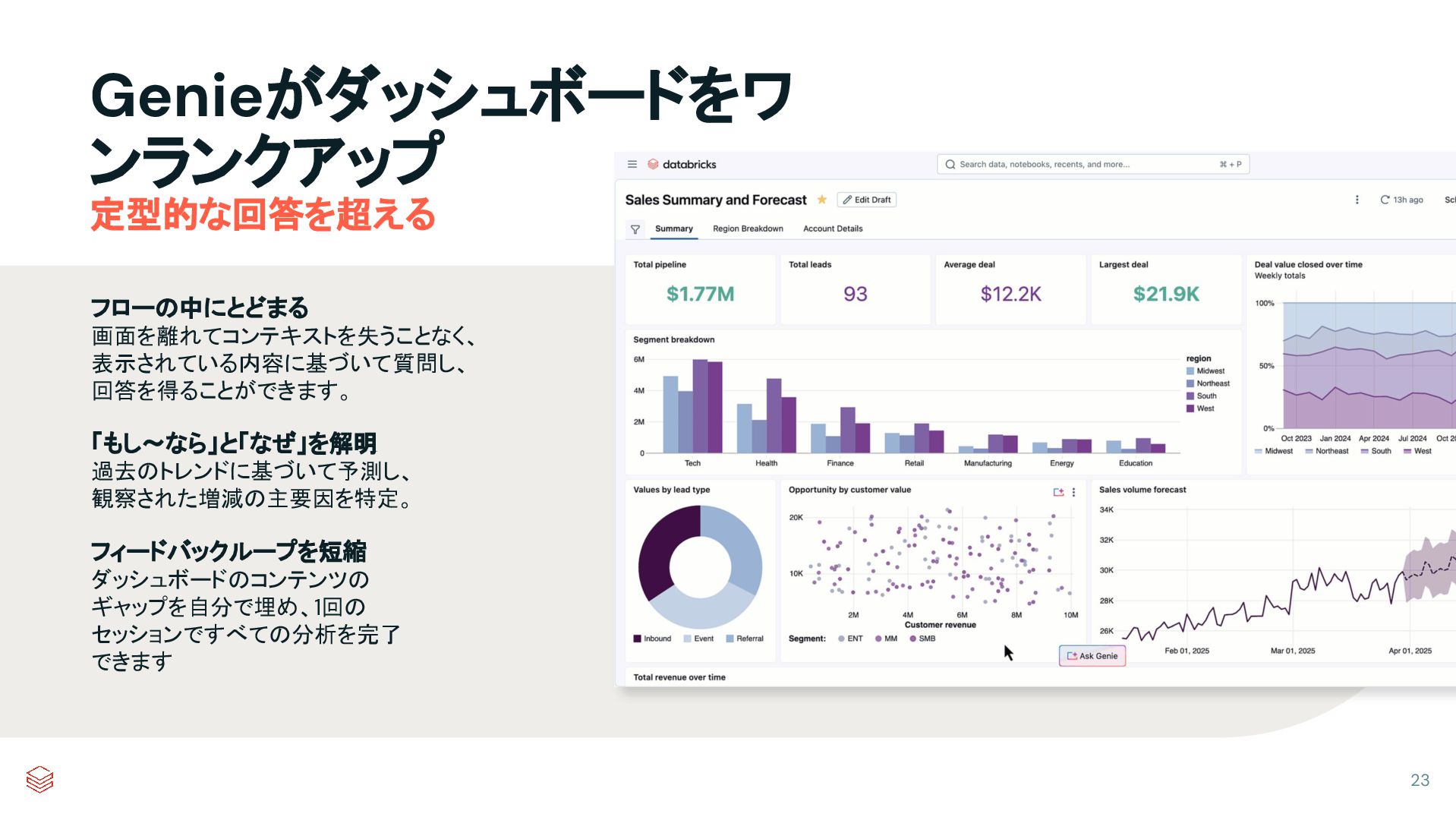 セッションですべての分析を完了 できます Genieがダッシュボードをワ ンランクアップ 定型的な回答を超える 23