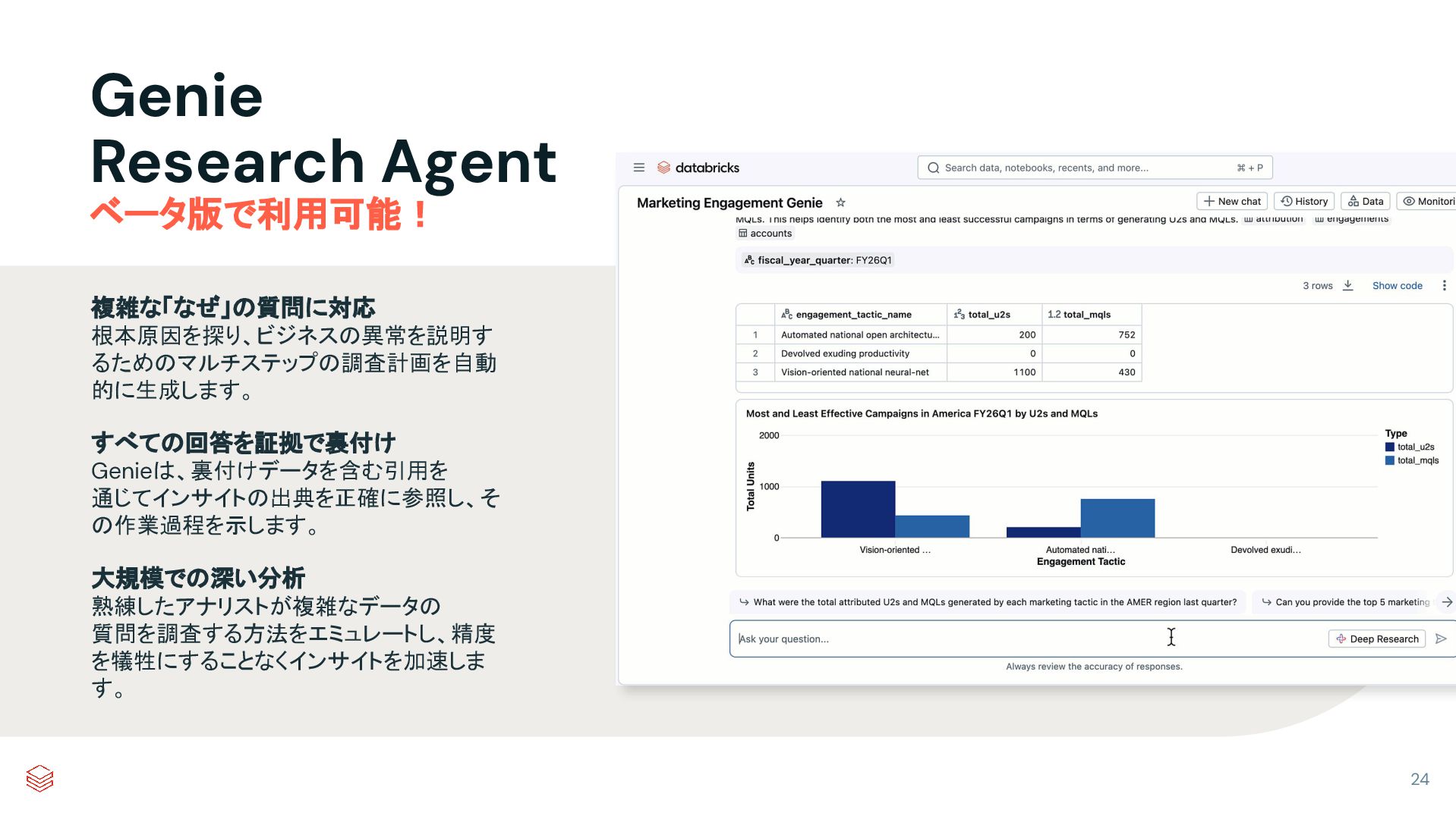 質問を調査する方法をエミュレートし、精度 を犠牲にすることなくインサイトを加速しま す。 Genie Research Agent ベータ版で利用可能! 24