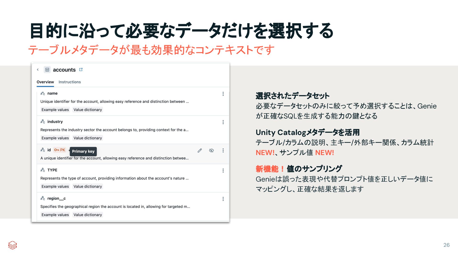 新機能!値のサンプリング Genieは誤った表現や代替プロンプト値を正しいデータ値に マッピングし、正確な結果を返します テーブルメタデータが最も効果的なコンテキストです
