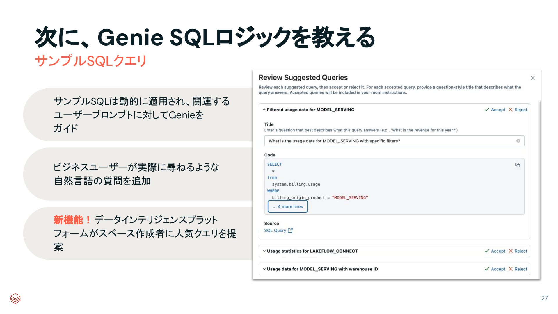 次に、Genie SQLロジックを教える 27 サンプルSQLクエリ サンプルSQLは動的に適用され、関連する ユーザープロンプトに対してGenieを ガイド ビジネスユーザーが実際に尋ねるような 自然言語の質問を追加 新機能!データインテリジェンスプラット