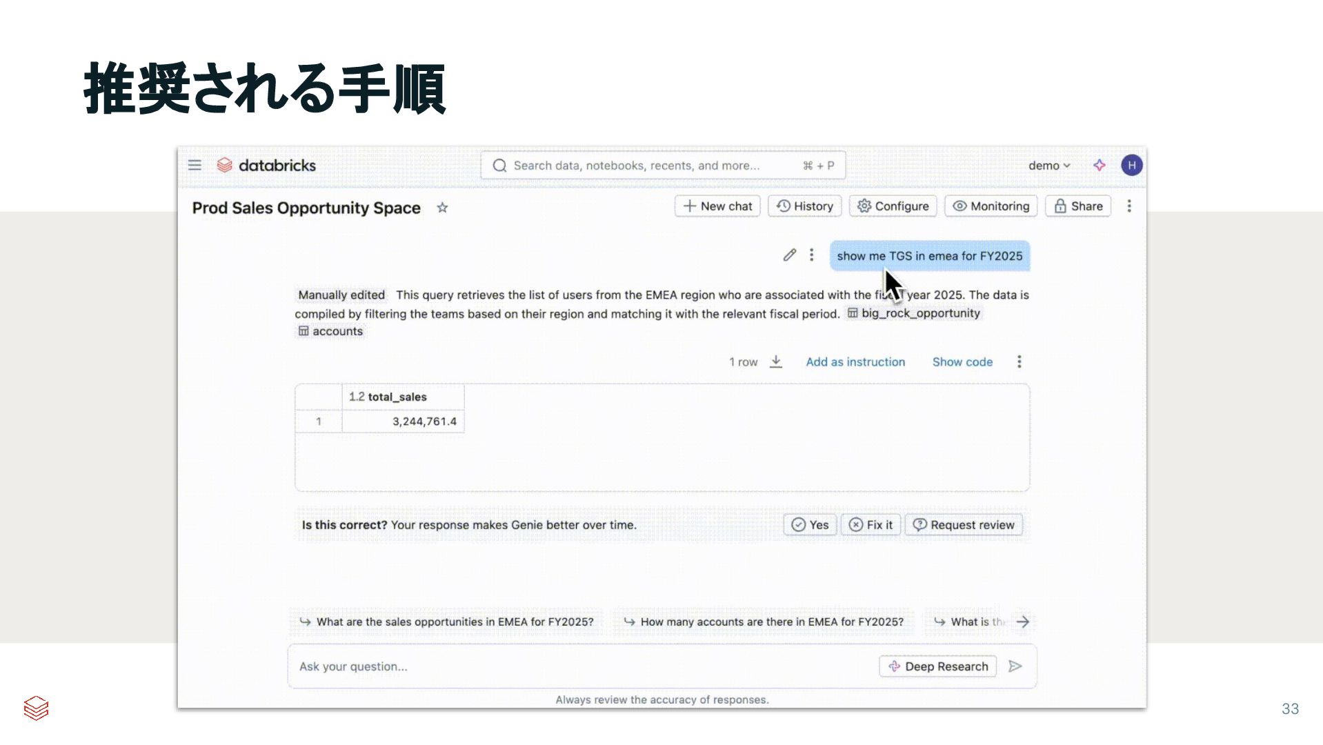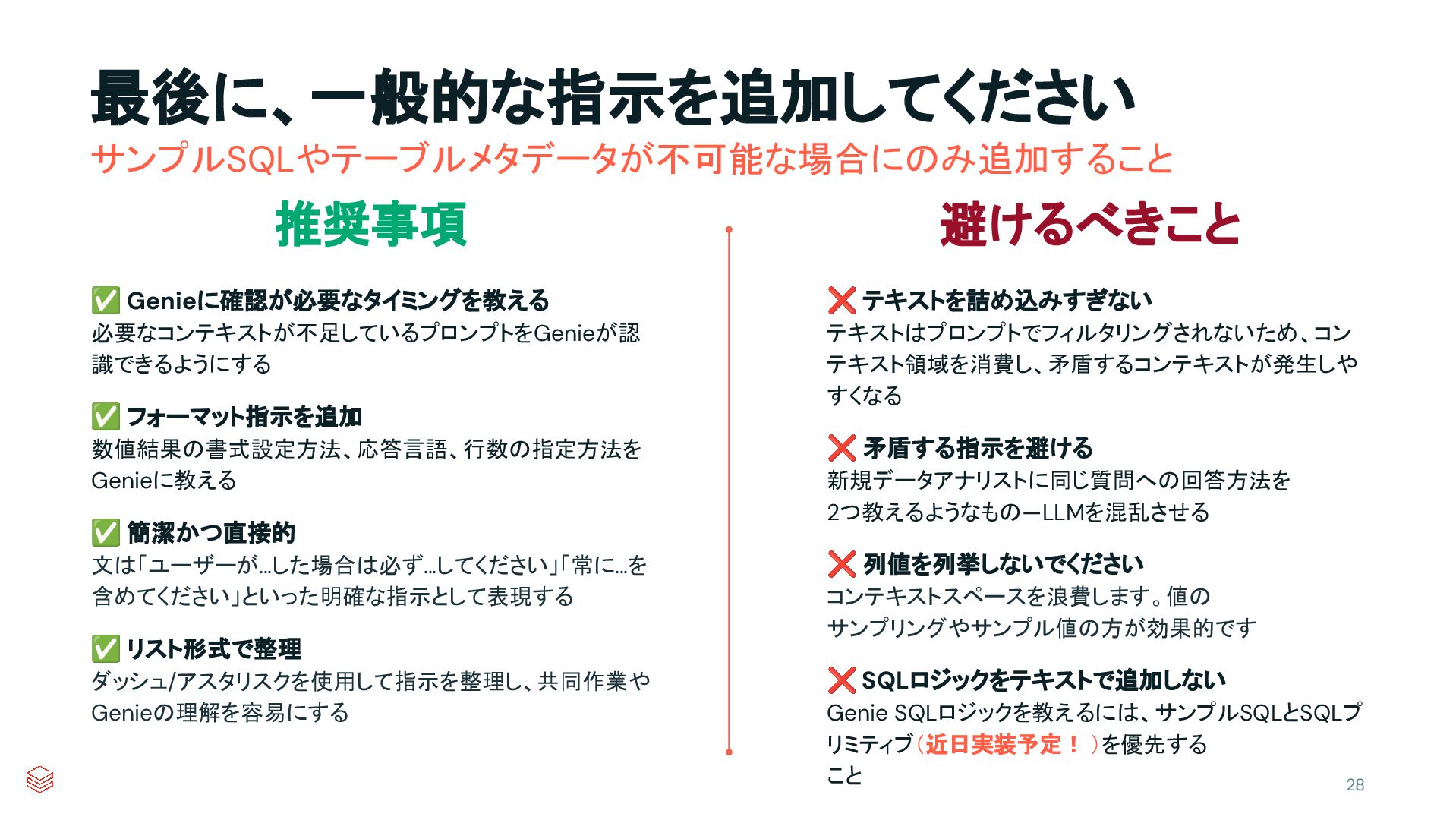 ✅ 簡潔かつ直接的 文は「ユーザーが…した場合は必ず…してください」「常に…を 含めてください」といった明確な指示として表現する ✅ リスト形式で整理 ダッシュ/アスタリスクを使用して指示を整理し、共同作業や Genieの理解を容易にする ❌ テキストを詰め込みすぎない テキストはプロンプトでフィルタリングされないため、コン テキスト領域を消費し、矛盾するコンテキストが発生しや すくなる ❌ 矛盾する指示を避ける 新規データアナリストに同じ質問への回答方法を 2つ教えるようなもの—LLMを混乱させる ❌ 列値を列挙しないでください コンテキストスペースを浪費します。値の サンプリングやサンプル値の方が効果的です ❌ SQLロジックをテキストで追加しない Genie SQLロジックを教えるには、サンプルSQLとSQLプ リミティブ(近日実装予定! )を優先する こと 推奨事項 避けるべきこと サンプルSQLやテーブルメタデータが不可能な場合にのみ追加すること
