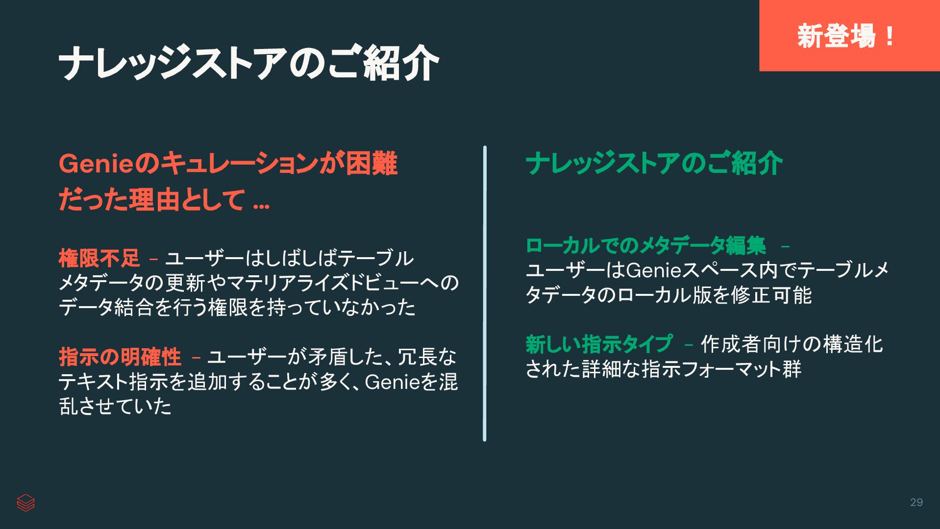 ローカルでのメタデータ編集 - ユーザーはGenieスペース内でテーブルメ タデータのローカル版を修正可能 新しい指示タイプ - 作成者向けの構造化 された詳細な指示フォーマット群 29 Genieのキュレーションが困難 だった理由として … ナレッジストアのご紹介 ナレッジストアのご紹介 新登場!