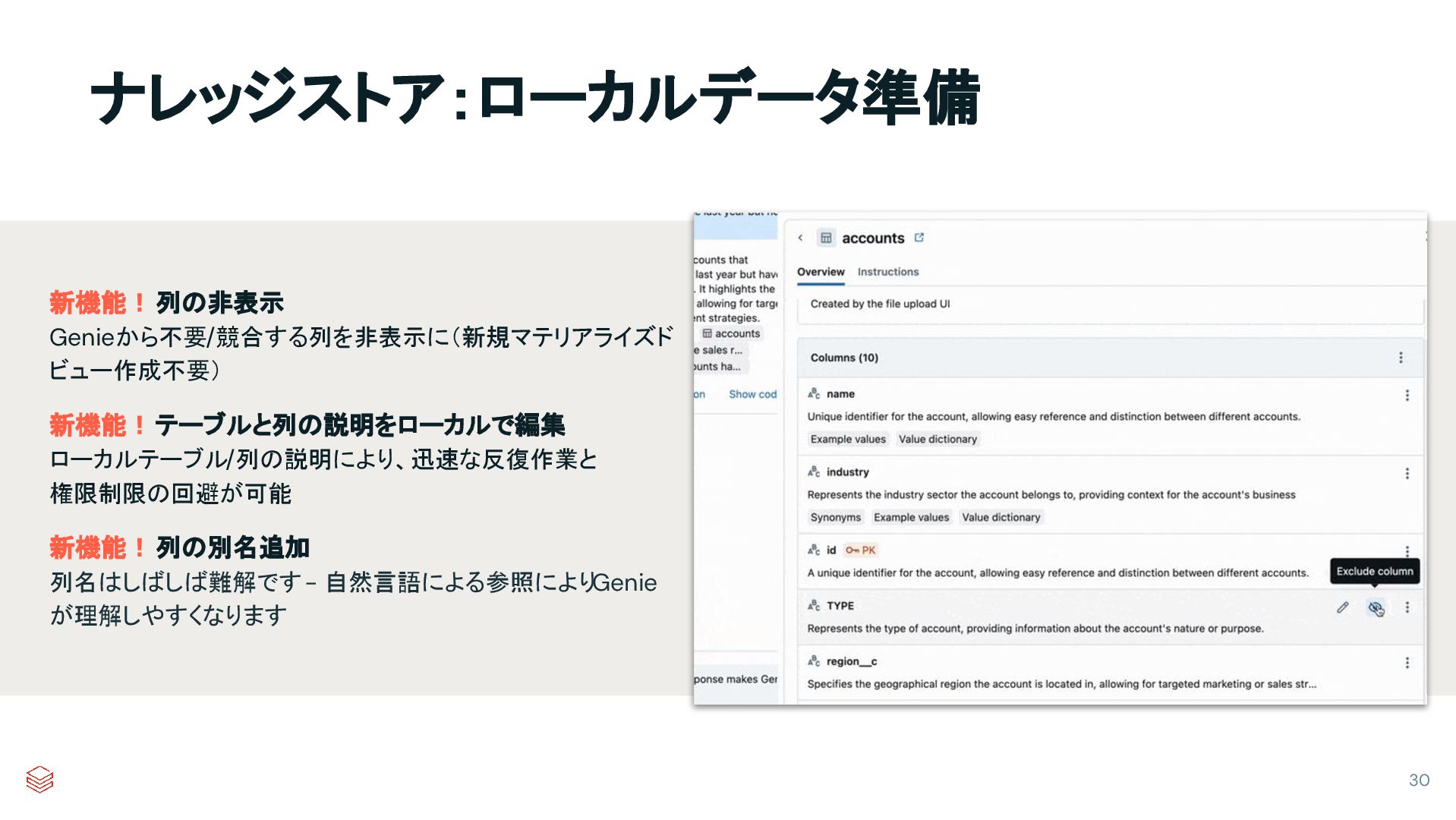 ナレッジストア:ローカルデータ準備 新機能!列の非表示 Genieから不要/競合する列を非表示に(新規マテリアライズド ビュー作成不要) 新機能!テーブルと列の説明をローカルで編集 ローカルテーブル/列の説明により、迅速な反復作業と 権限制限の回避が可能 新機能!列の別名追加 列名はしばしば難解です -