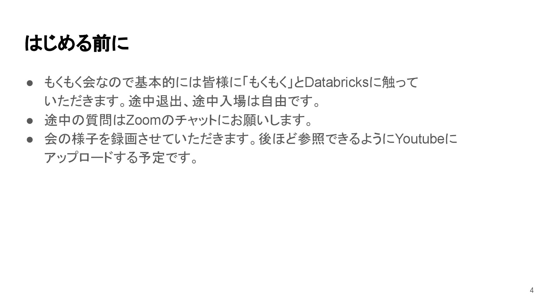 はじめる前に • もくもく会なので基本的には皆様に「もくもく」とDatabricksに触って いただきます。途中退出、途中入場は自由です。 • 途中の質問はZoomのチャットにお願いします。 • 会の様子を録画させていただきます。後ほど参照できるようにYoutubeに アップロードする予定です。 4