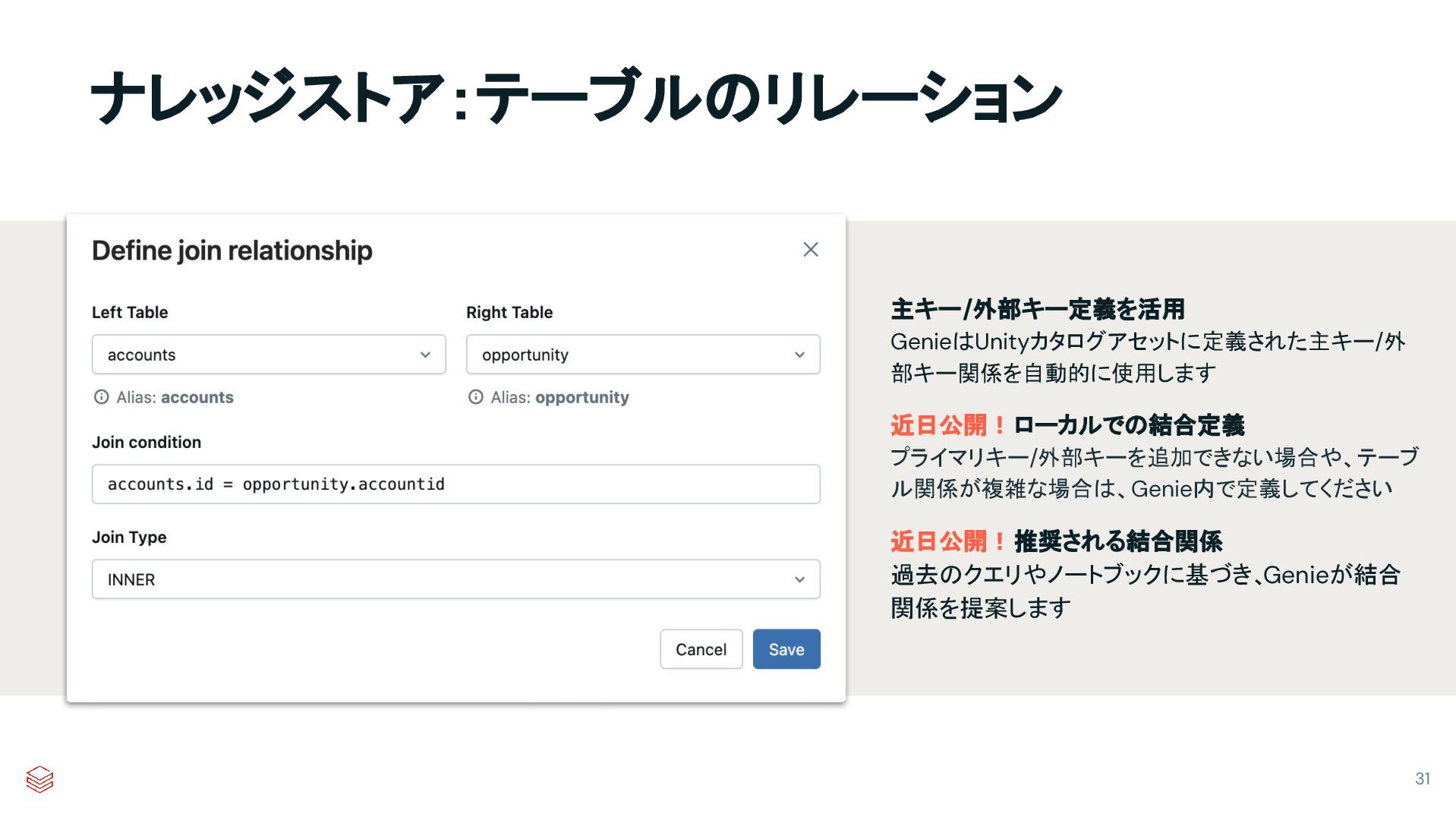主キー/外部キー定義を活用 GenieはUnityカタログアセットに定義された主キー/外 部キー関係を自動的に使用します 近日公開!ローカルでの結合定義 プライマリキー/外部キーを追加できない場合や、テーブ ル関係が複雑な場合は、Genie内で定義してください 近日公開!推奨される結合関係 過去のクエリやノートブックに基づき、 Genieが結合 関係を提案します