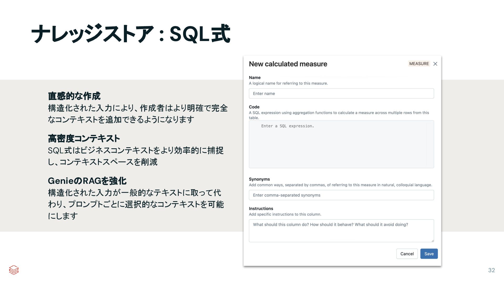 ナレッジストア : SQL式 直感的な作成 構造化された入力により、作成者はより明確で完全 なコンテキストを追加できるようになります 高密度コンテキスト SQL式はビジネスコンテキストをより効率的に捕捉 し、コンテキストスペースを削減 GenieのRAGを強化