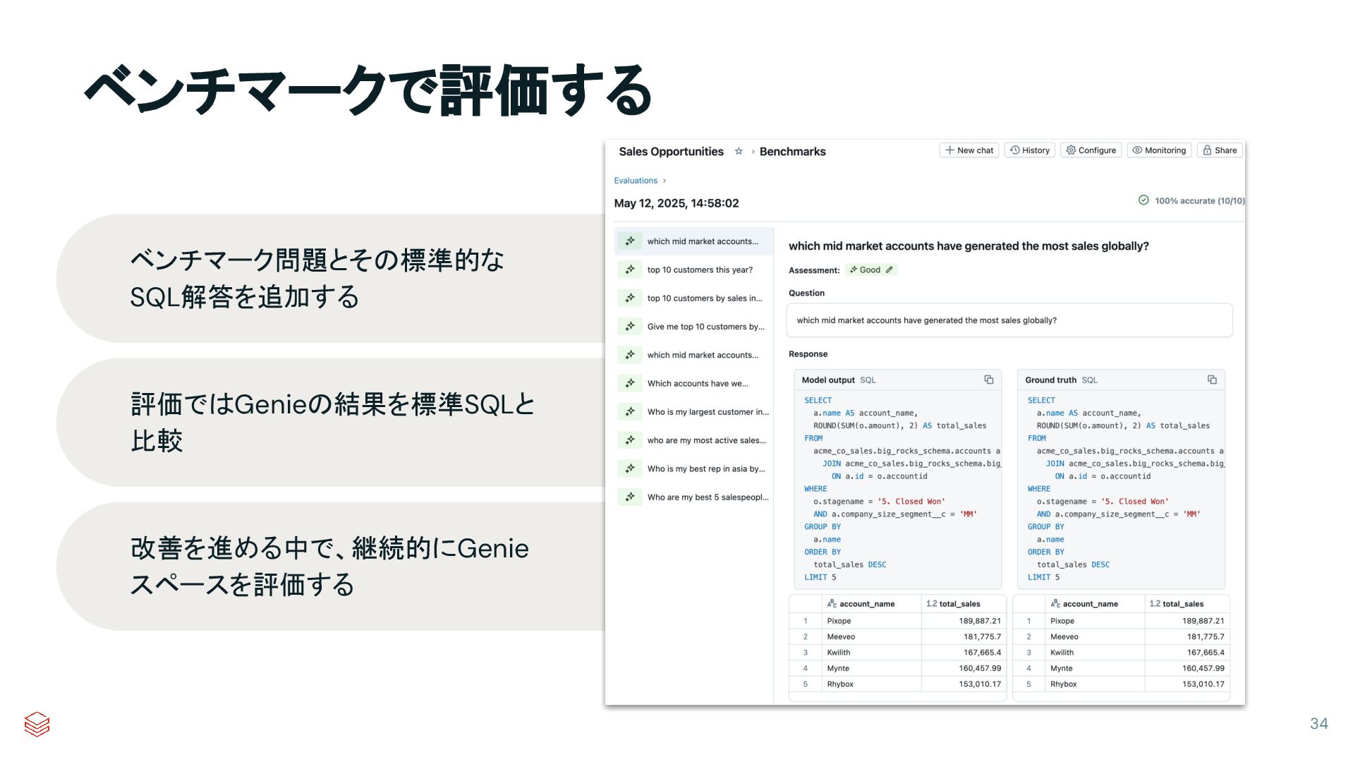 ベンチマークで評価する 34 ベンチマーク問題とその標準的な SQL解答を追加する 評価ではGenieの結果を標準SQLと 比較 改善を進める中で、継続的にGenie スペースを評価する