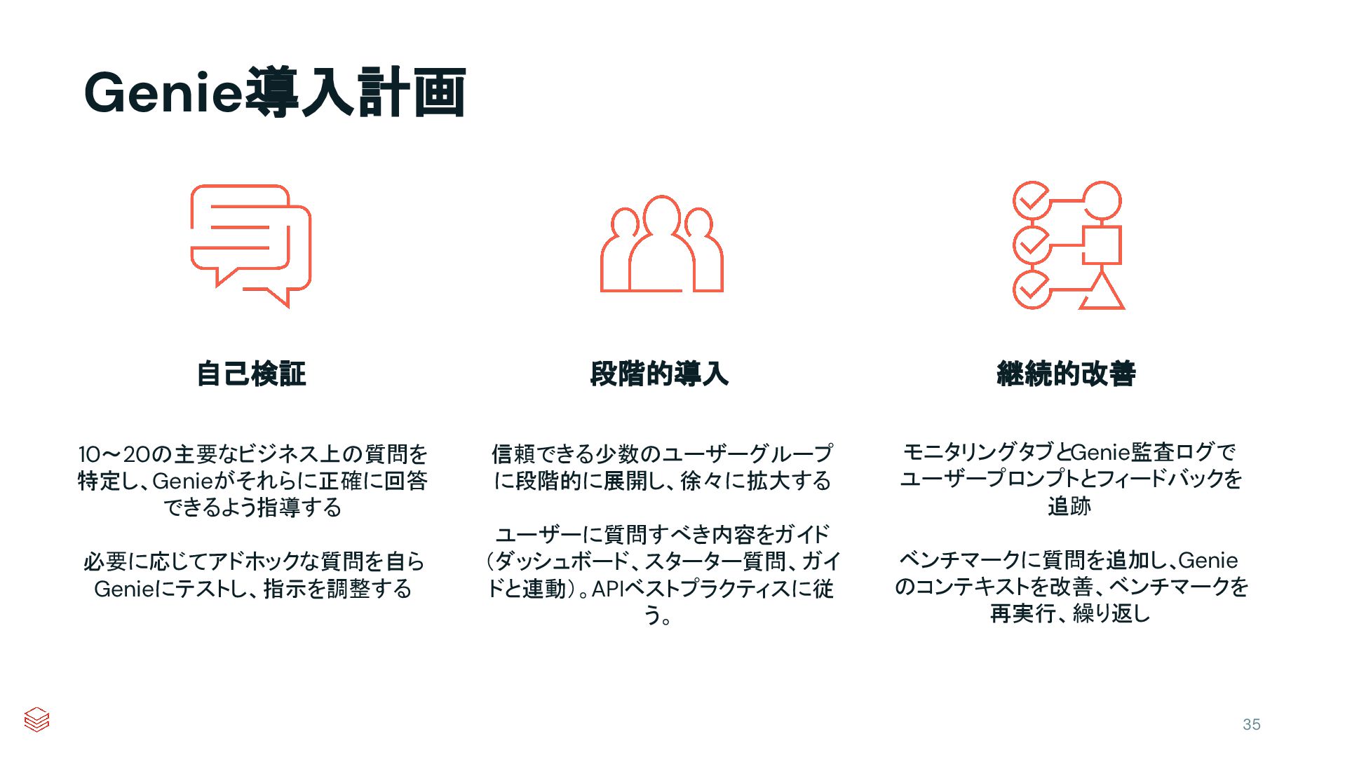 10~20の主要なビジネス上の質問を 特定し、Genieがそれらに正確に回答 できるよう指導する 必要に応じてアドホックな質問を自ら Genieにテストし、指示を調整する Genie導入計画 自己検証 段階的導入 継続的改善 信頼できる少数のユーザーグループ