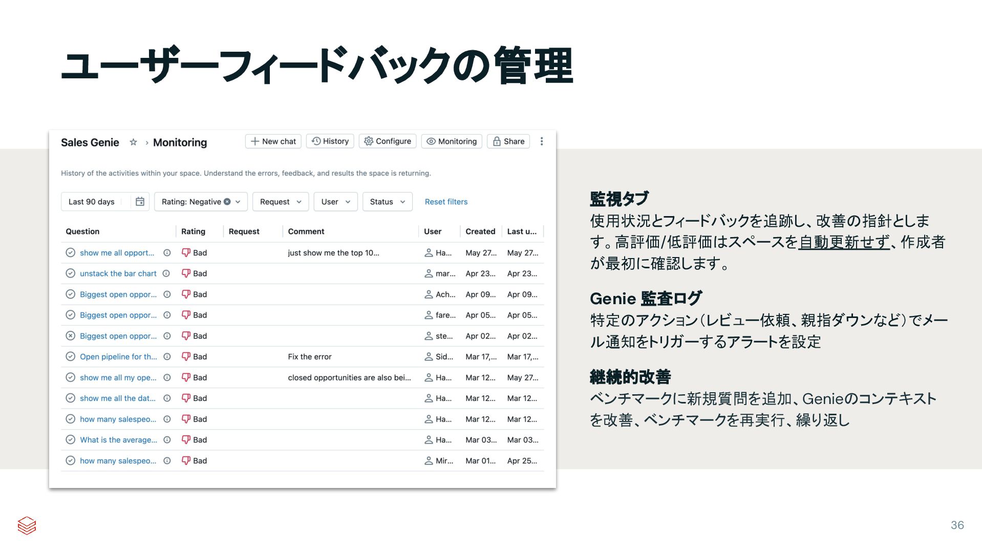 に段階的に展開し、徐々に拡大する ユーザーに質問すべき内容をガイド (ダッシュボード、スターター質問、ガイ ドと連動)。APIベストプラクティスに従 う。 モニタリングタブとGenie監査ログで ユーザープロンプトとフィードバックを 追跡 ベンチマークに質問を追加し、Genie のコンテキストを改善、ベンチマークを 再実行、繰り返し 35