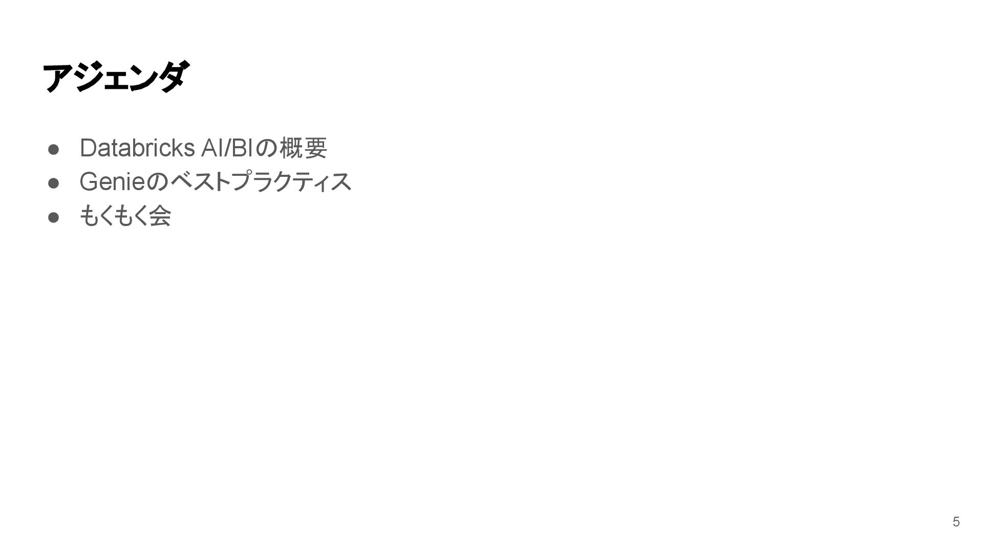 アジェンダ • Databricks AI/BIの概要 • Genieのベストプラクティス • もくもく会 5