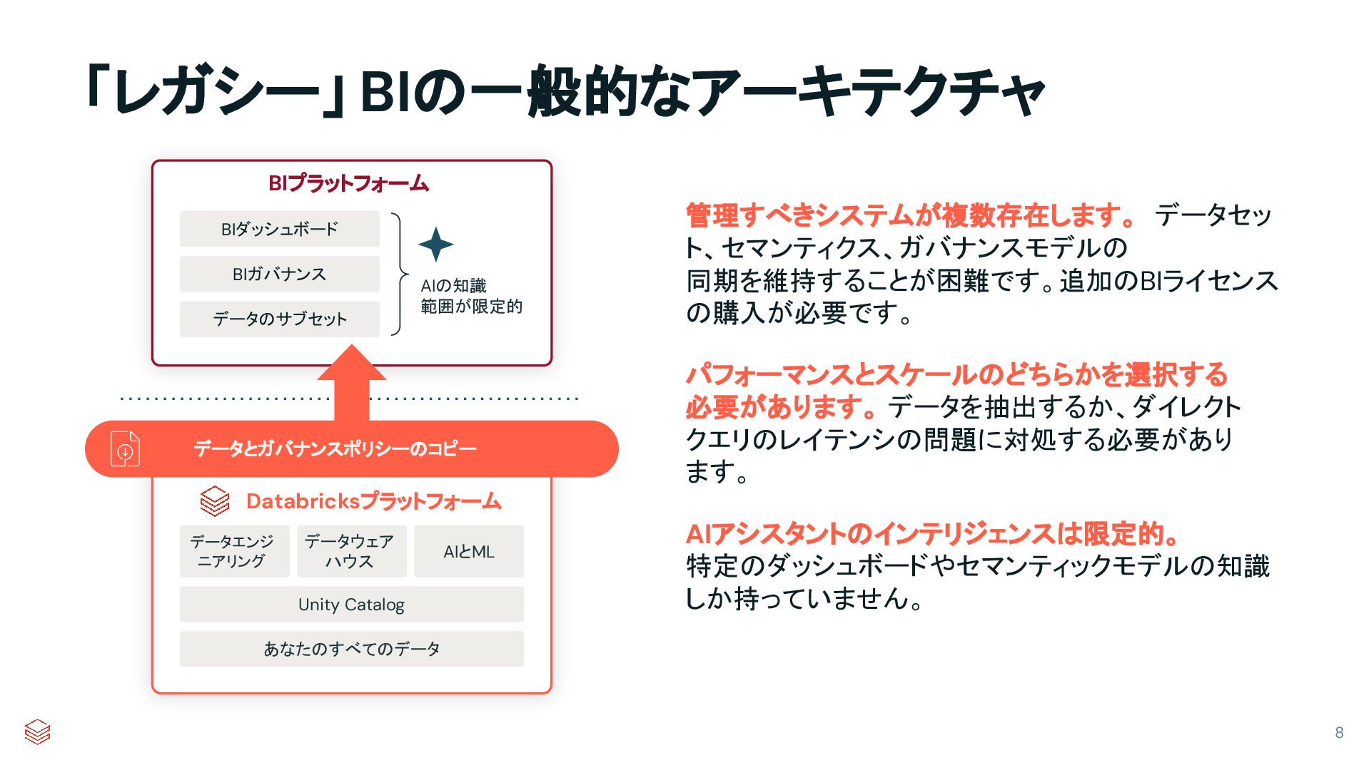 AIアシスタントのインテリジェンスは限定的。 特定のダッシュボードやセマンティックモデルの知識 しか持っていません。 管理すべきシステムが複数存在します。 データセッ ト、セマンティクス、ガバナンスモデルの 同期を維持することが困難です。追加のBIライセンス の購入が必要です。 パフォーマンスとスケールのどちらかを選択する 必要があります。