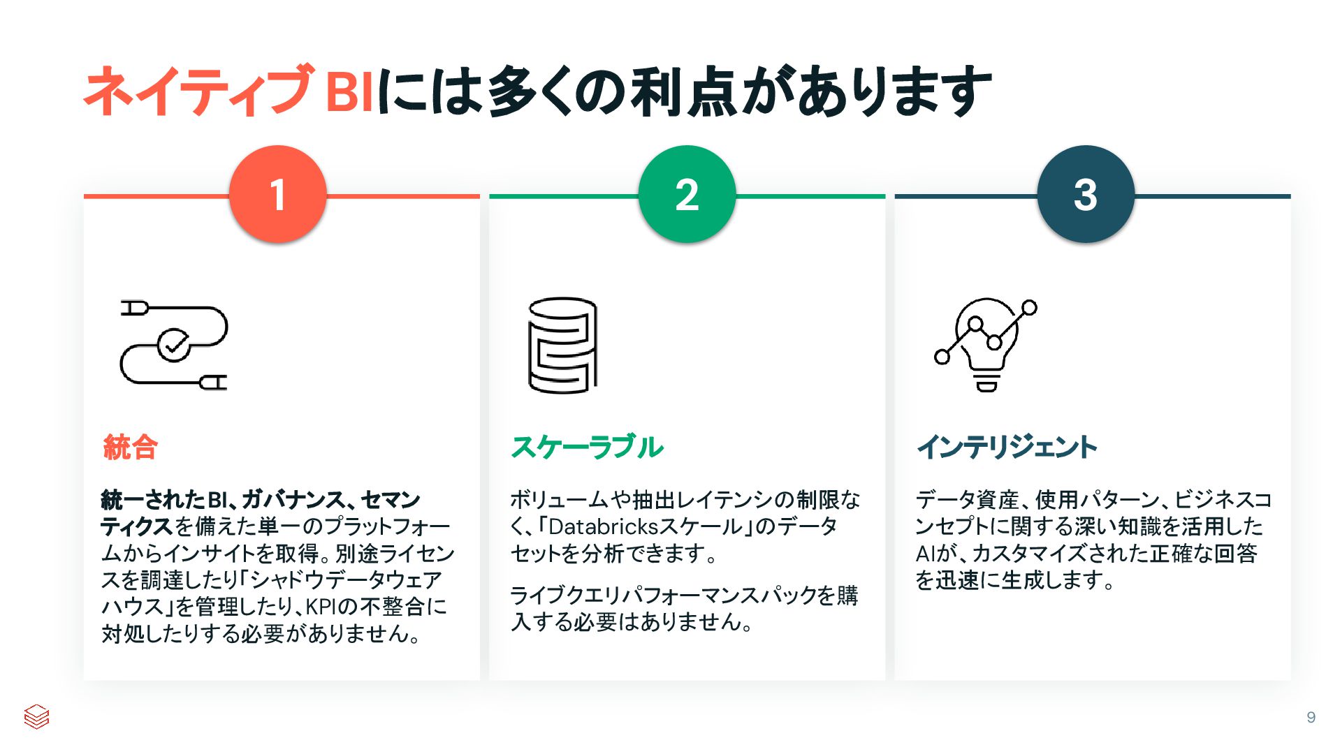データを抽出するか、ダイレクト クエリのレイテンシの問題に対処する必要があり ます。 BIプラットフォーム Databricksプラットフォーム Unity Catalog データウェア ハウス AIとML データエンジ ニアリング あなたのすべてのデータ データのサブセット BIガバナンス BIダッシュボード AIの知識 範囲が限定的 データとガバナンスポリシーのコピー 「レガシー」 BIの一般的なアーキテクチャ 8