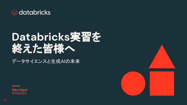 Databricks実習を 終えた皆様へ Taka Yayoi 2025/12/2 データサイエンスと生成AIの未来 1
