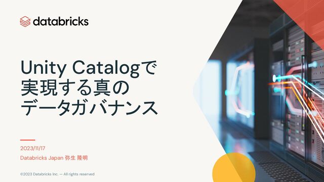 dashboards Data lake Data warehouse Permissions on files Permissions on tables, rows and columns Permissions on ML models, features Permissions on reports, dashboards Data Governance Team Data scientist Data engineer Data analyst Data Consumers Applications “Where are the datasets, models, notebooks, dashboards that I need?” “Can I trust the data and ML models?” “How to secure these assets?” “Who is accessing these assets and how?” “Are we meeting the regulatory compliance? ” Unity Catalogが価値を解放します データとAIの統合ビュー データとAIに対する シンプルな権限モデル AIで強化された監視と 観測可能性 オープンなデータ共有 イノベーションの加速 プラットフォームの複雑性とコ ストの削減 リスクの低減と コンプライアンスの保証 データの価値の連携と 収益化