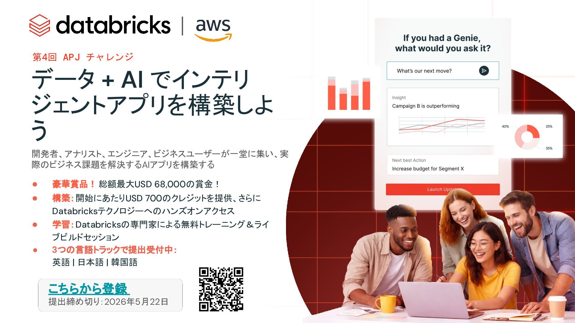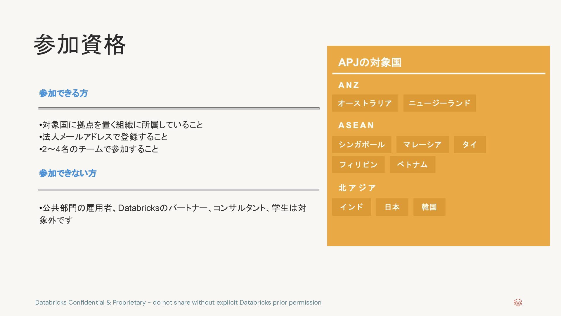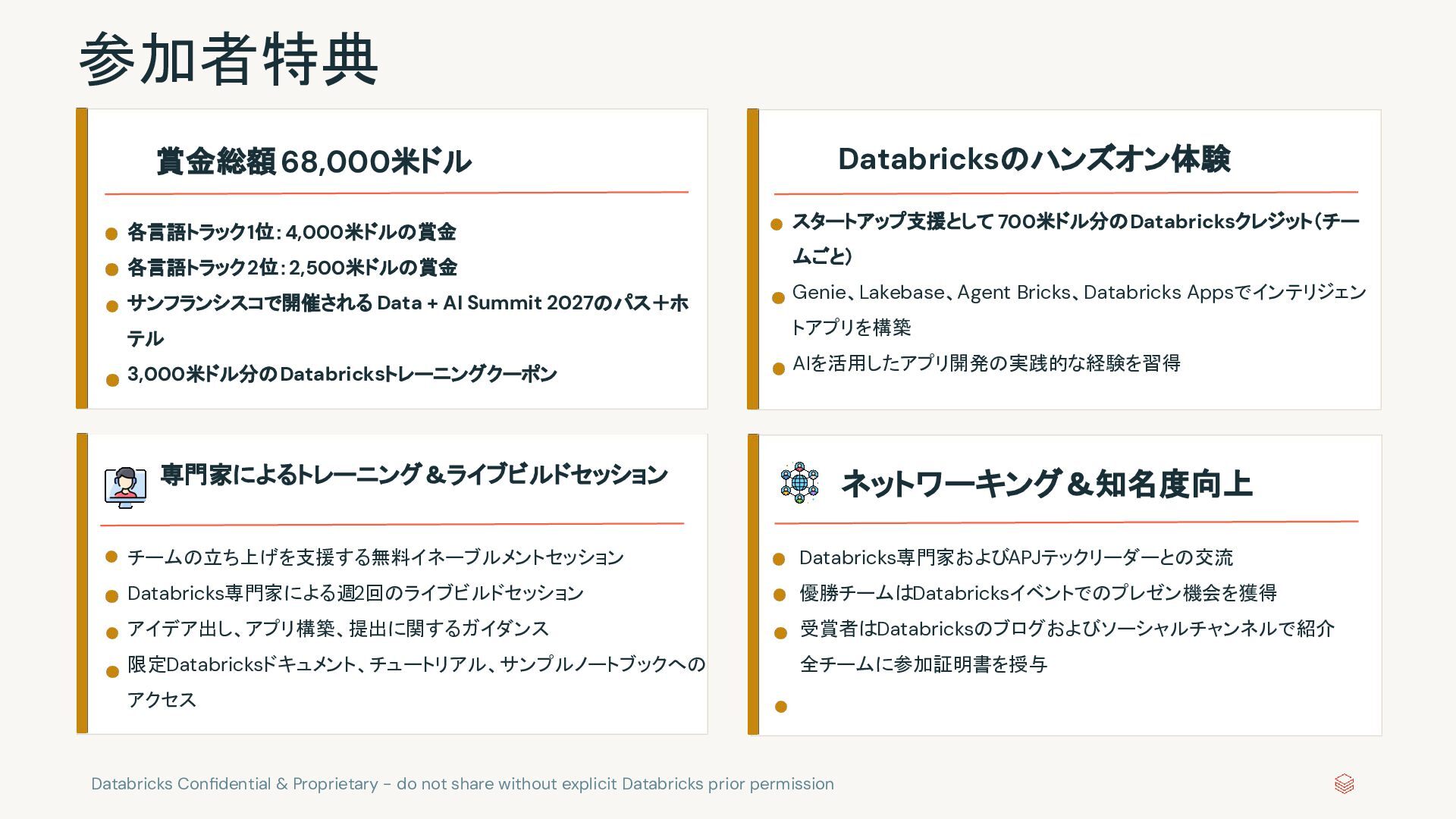 Databricks prior permission 参加者特典 賞金総額68,000米ドル Databricksのハンズオン体験 専門家によるトレーニング&ライブビルドセッション ネットワーキング&知名度向上 各言語トラック1位:4,000米ドルの賞金 各言語トラック2位:2,500米ドルの賞金 サンフランシスコで開催される Data + AI Summit 2027のパス+ホ テル 3,000米ドル分のDatabricksトレーニングクーポン スタートアップ支援として 700米ドル分のDatabricksクレジット(チー ムごと) Genie、Lakebase、Agent Bricks、Databricks Appsでインテリジェン トアプリを構築 AIを活用したアプリ開発の実践的な経験を習得 チームの立ち上げを支援する無料イネーブルメントセッション Databricks専門家による週2回のライブビルドセッション アイデア出し、アプリ構築、提出に関するガイダンス 限定Databricksドキュメント、チュートリアル、サンプルノートブックへの アクセス Databricks専門家およびAPJテックリーダーとの交流 優勝チームはDatabricksイベントでのプレゼン機会を獲得 受賞者はDatabricksのブログおよびソーシャルチャンネルで紹介 全チームに参加証明書を授与