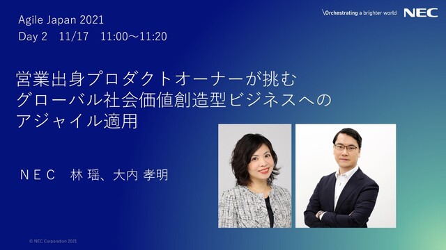 Division Global Business Unit 10+ years in global sales for several Deep knowhow of business alliance with partners Albert & team NEC Laboratories Singapore (NLS) Considerable expertise in software design and operating systems Product Owner Scrum Master Tuan & team NEC Vietnam Considerable expertise in software development Agile Coach Development Team Takaaki Ouchi Software Engineering Division Agile Promotion Group 3+ years in Agile coaching and standardization Deep knowledge of Agile and Scrum Supporter Kumiko Yoshitomi Corporate Business Development Division Global Innovation Unit 4+ years in biz-dev for several industries Deep knowledge of lean startup method Isara, Jongkon & team BD Team / NEC Thailand Know the market well Has connection with customers