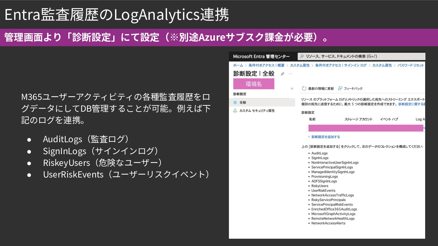 Entra監査履歴のLogAnalytics連携 管理画⾯より「診断設定」にて設定(※別途Azureサブスク課⾦が必要)。 環境名 M365ユーザーアクティビティの各種監査履歴をロ グデータにしてDB管理することが可能。例えば下 記のログを連携。 • AuditLogs(監査ログ) • SignInLogs(サインインログ)