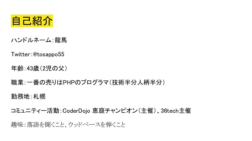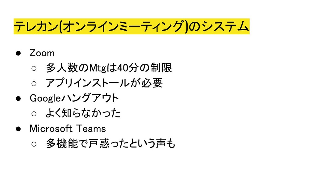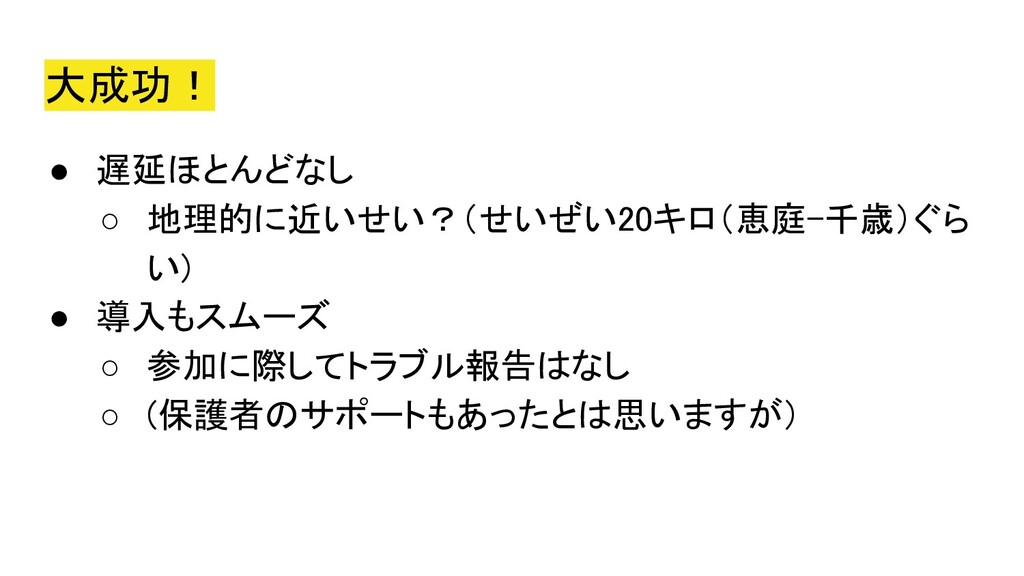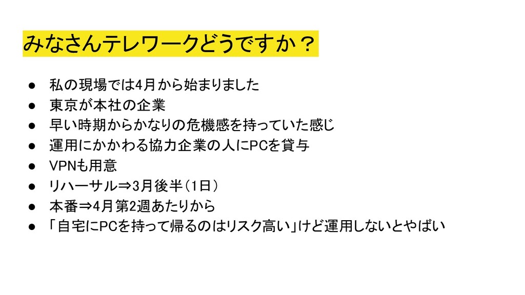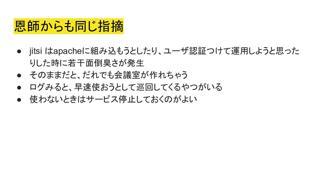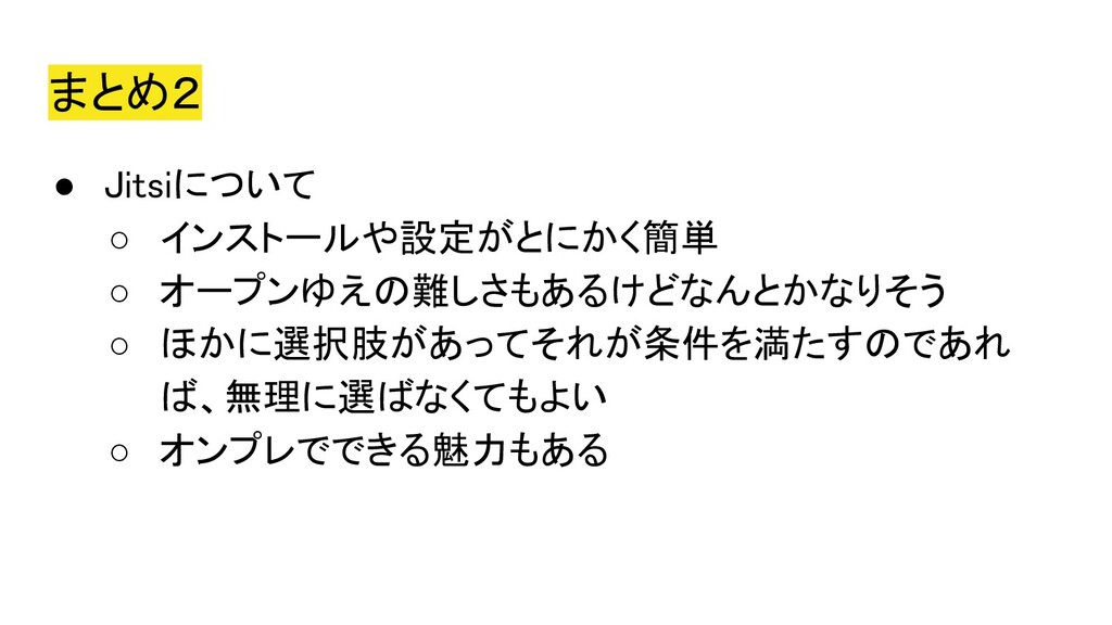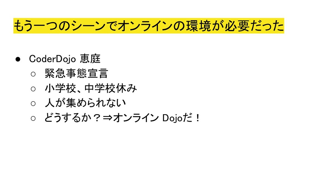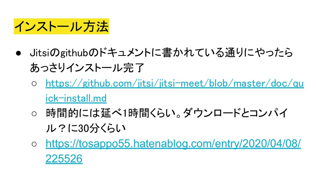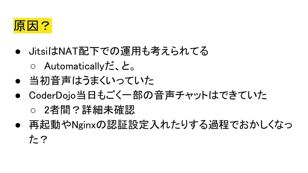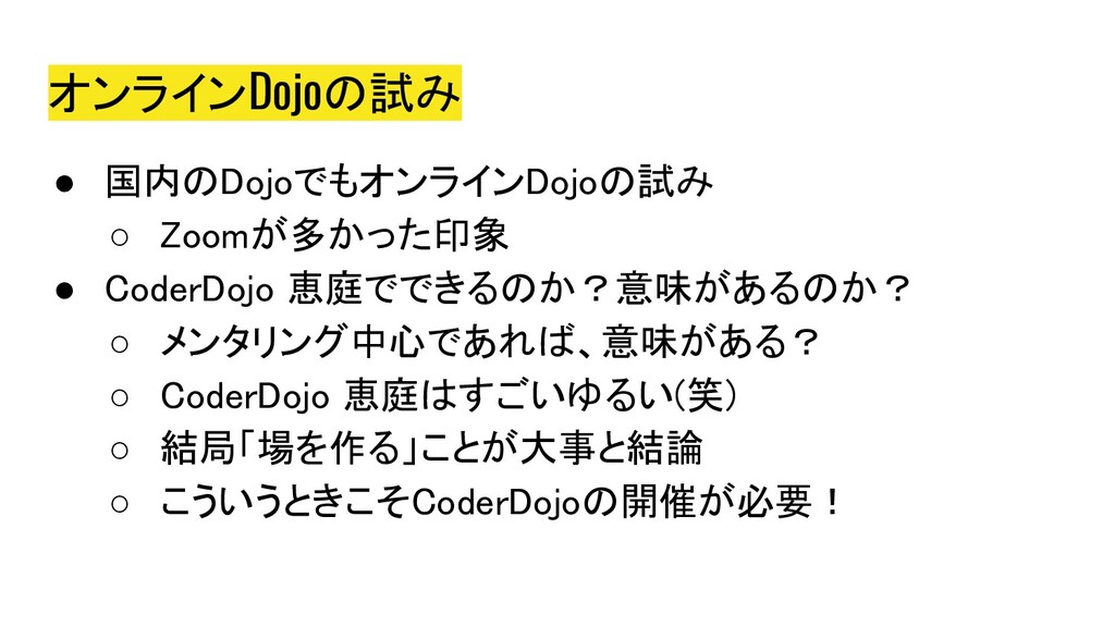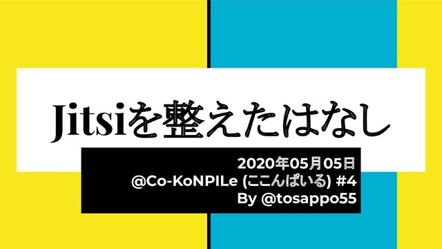 2020年5月5日にオンラインにて開催された、Co-KoNPILe (ここんぱいる) #4 - 屋根より高い発表会ともくもく懇親会(新概念)にて発表した資料です。 自分にとってオンラインミーティングシステムが必要になった簡単な経緯から、Jitsiを知ったきっかけ、CoderDojoで利用しようと思い立ち、セットアップから検証、(失敗を経て)実施までの四方山をプレゼンテーションしました。