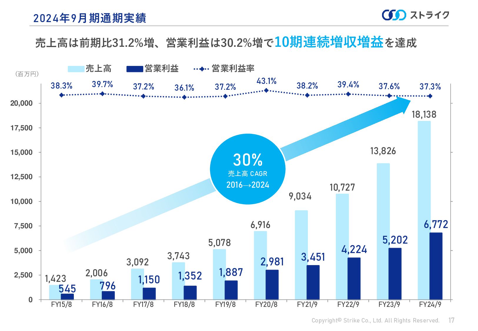 3,092 3,743 5,078 6,916 9,034 10,727 13,826 18,138 545 796 1,150 1,352 1,887 2,981 3,451 4,224 5,202 6,772 38.3% 39.7% 37.2% 36.1% 37.2% 43.1% 38.2% 39.4% 37.6% 37.3% 0 2,500 5,000 7,500 10,000 12,500 15,000 17,500 20,000 FY15/8 FY16/8 FY17/8 FY18/8 FY19/8 FY20/8 FY21/9 FY22/9 FY23/9 FY24/9 売上高 営業利益 営業利益率 30% 売上高 CAGR 2016→2024 (百万円) 2024年9月期通期実績 売上高は前期比31.2%増、営業利益は30.2%増で10期連続増収増益を達成