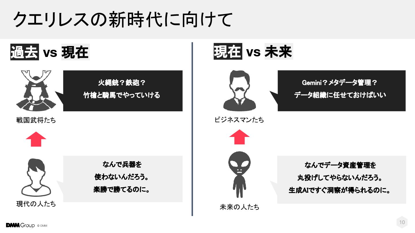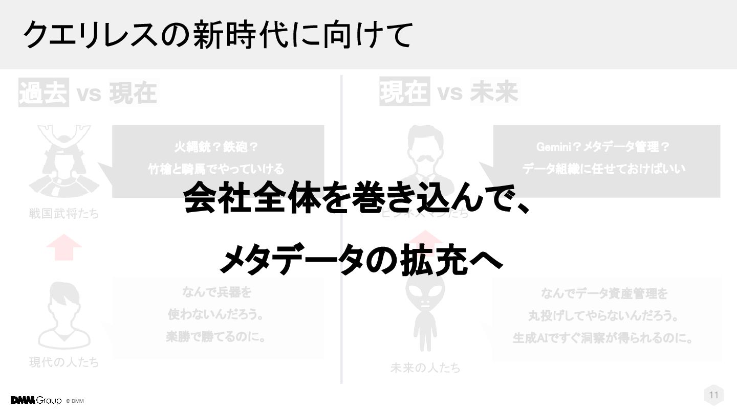 現在 現在 vs 未来 火縄銃?鉄砲? 竹槍と騎馬でやっていける なんで兵器を 使わないんだろう。 楽勝で勝てるのに。 Gemini?メタデータ管理? データ組織に任せておけばいい なんでデータ資産管理を 丸投げしてやらないんだろう。 生成AIですぐ洞察が得られるのに。 会社全体を巻き込んで、 メタデータの拡充へ