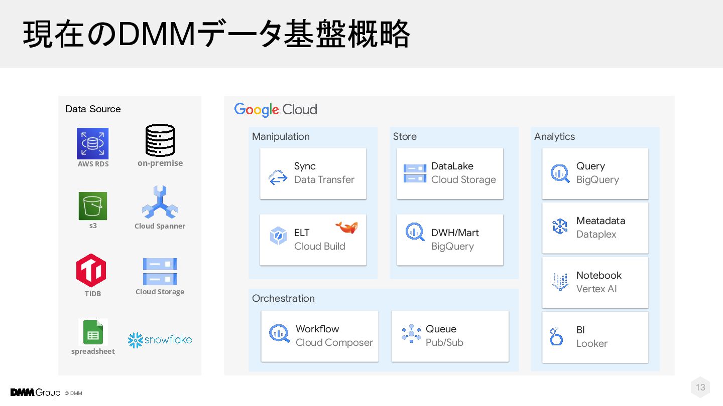 © DMM 現在のDMMデータ基盤概略 13 Cloud Storage TiDB on-premise spreadsheet AWS