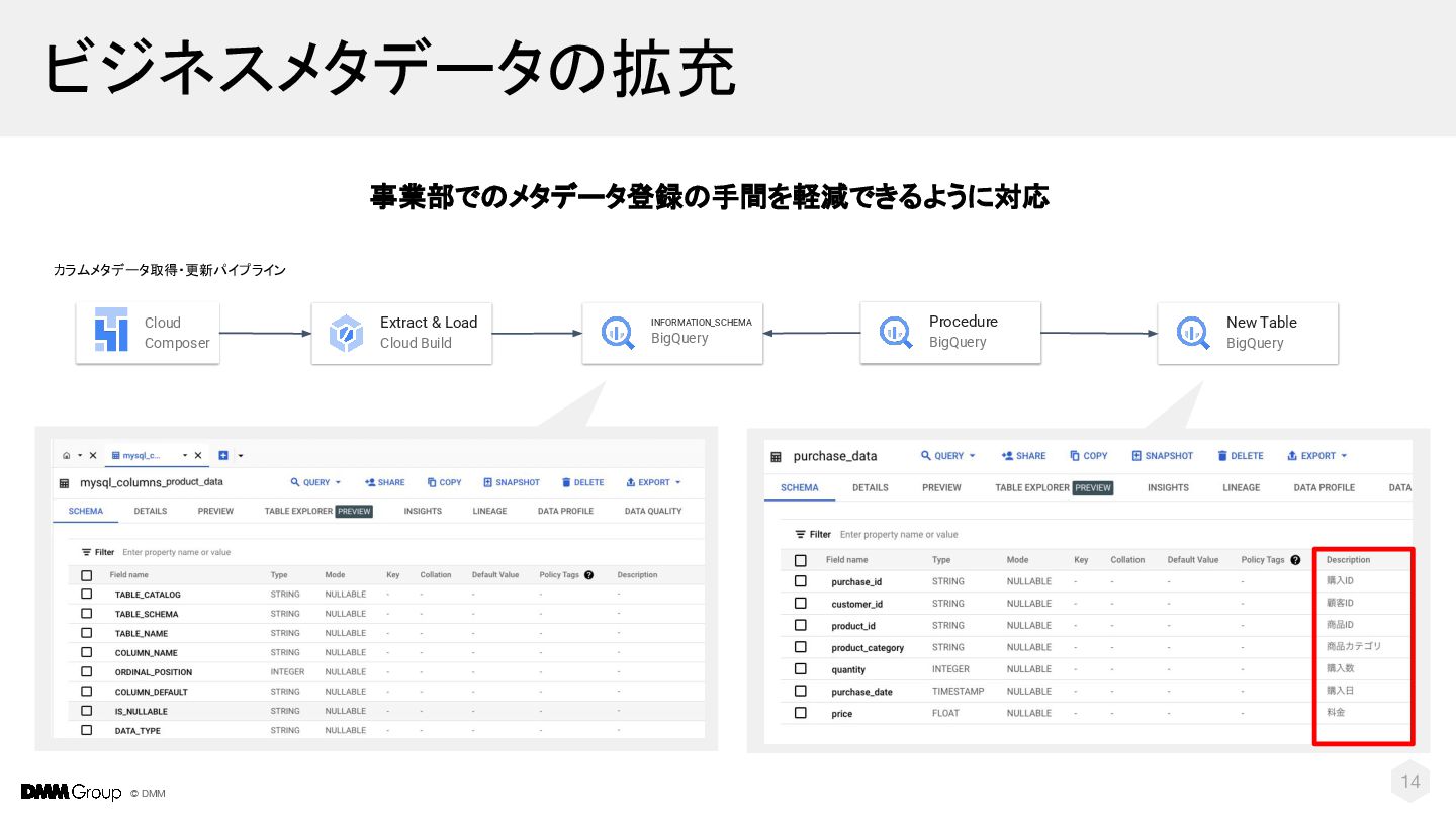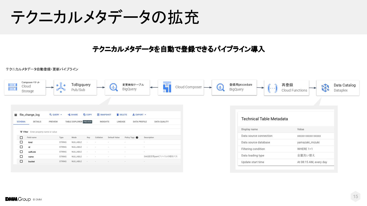 © DMM ビジネスメタデータの拡充 14 事業部でのメタデータ登録の手間を軽減できるように対応 Cloud Composer カラムメタデータ取得・更新パイプライン Procedure BigQuery