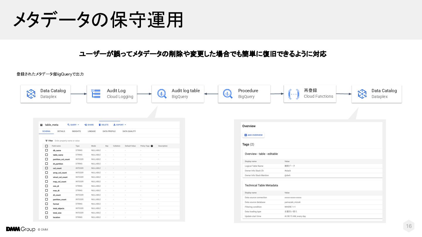 © DMM テクニカルメタデータの拡充 15 テクニカルメタデータを自動で登録できるパイプライン導入 テクニカルメタデータ自動登録・更新パイプライン Composerバケット Cloud Storage ToBigquery
