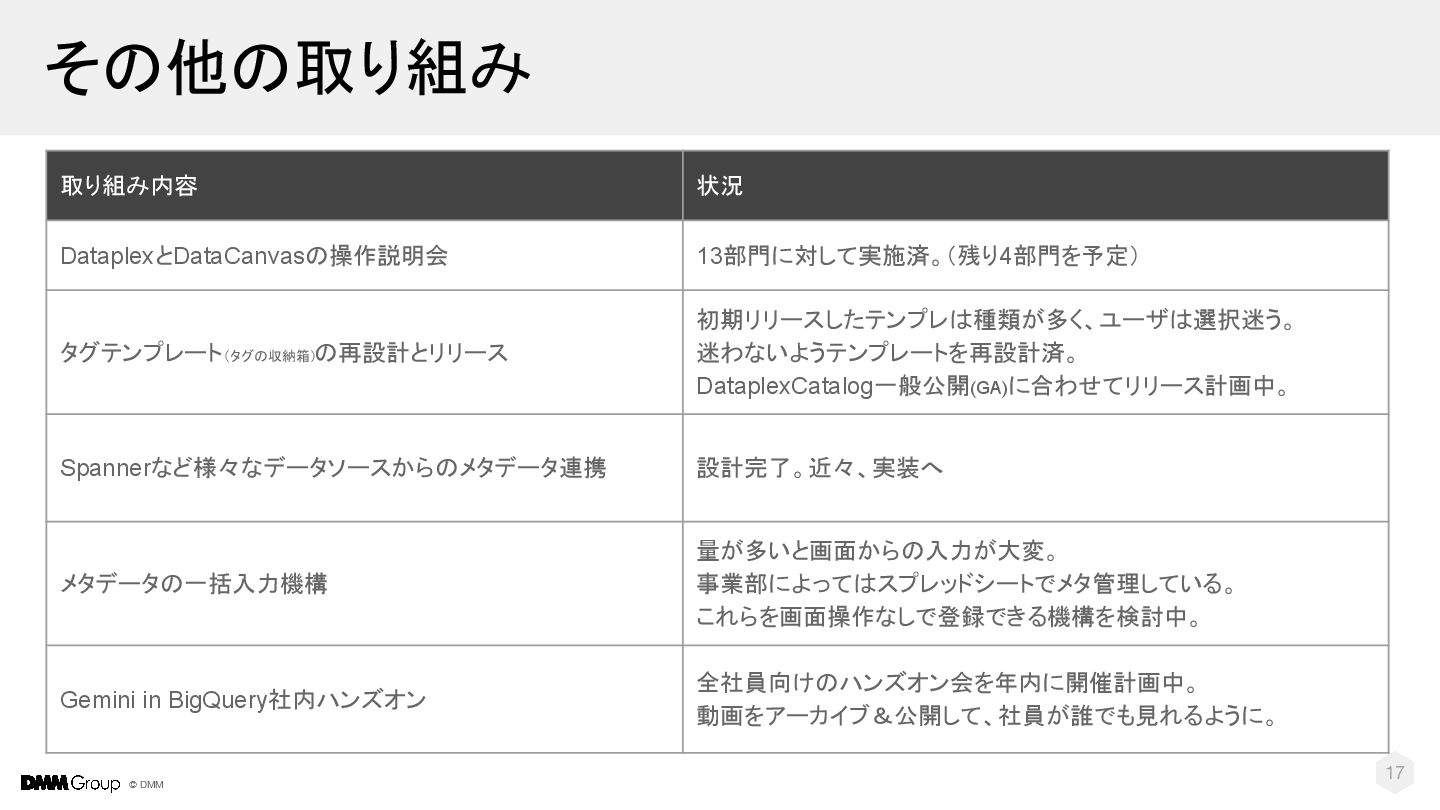 © DMM その他の取り組み 17 取り組み内容 状況 DataplexとDataCanvasの操作説明会 13部門に対して実施済。(残り4部門を予定) タグテンプレート(タグの収納箱) の再設計とリリース
