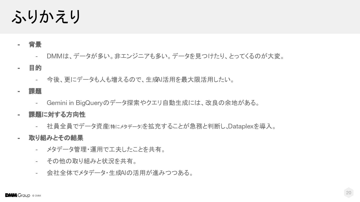 - 今後、更にデータも人も増えるので、生成 AI活用を最大限活用したい。 - 課題 - Gemini in BigQueryのデータ探索やクエリ自動生成には、改良の余地がある。 - 課題に対する方向性 - 社員全員でデータ資産(特にメタデータ)を拡充することが急務と判断し、 Dataplexを導入。 - 取り組みとその結果 - メタデータ管理・運用で工夫したことを共有。 - その他の取り組みと状況を共有。 - 会社全体でメタデータ・生成 AIの活用が進みつつある。