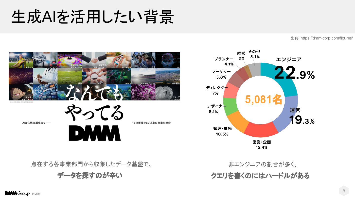 © DMM 生成AIを活用したい背景 5 点在する各事業部門から収集したデータ基盤で、 データを探すのが辛い 非エンジニアの割合が多く、 クエリを書くのにはハードルがある 5,081名 出典: