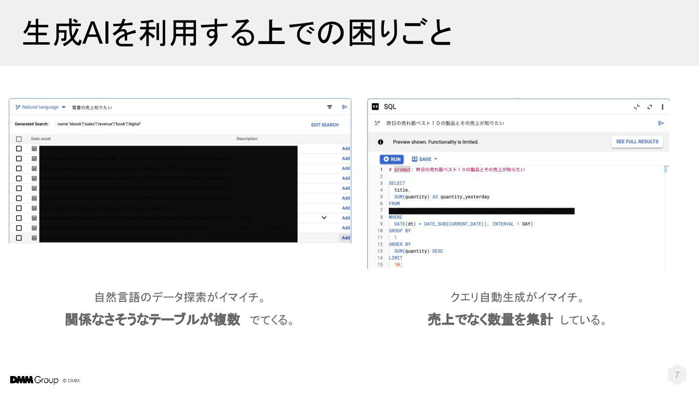 © DMM 生成AIを利用する上での困りごと 7 自然言語のデータ探索がイマイチ。 関係なさそうなテーブルが複数 でてくる。 クエリ自動生成がイマイチ。 売上でなく数量を集計 している。