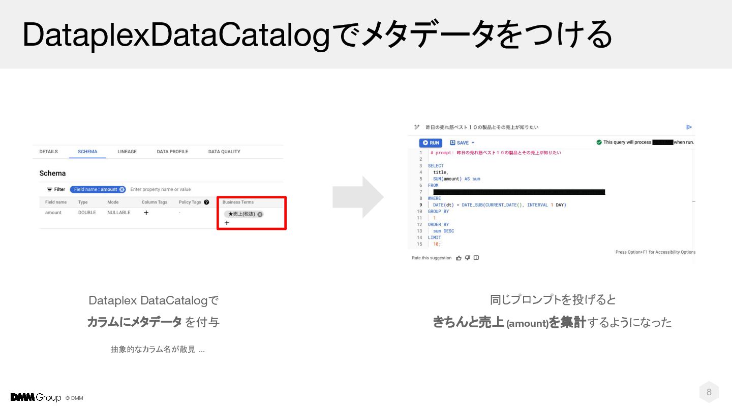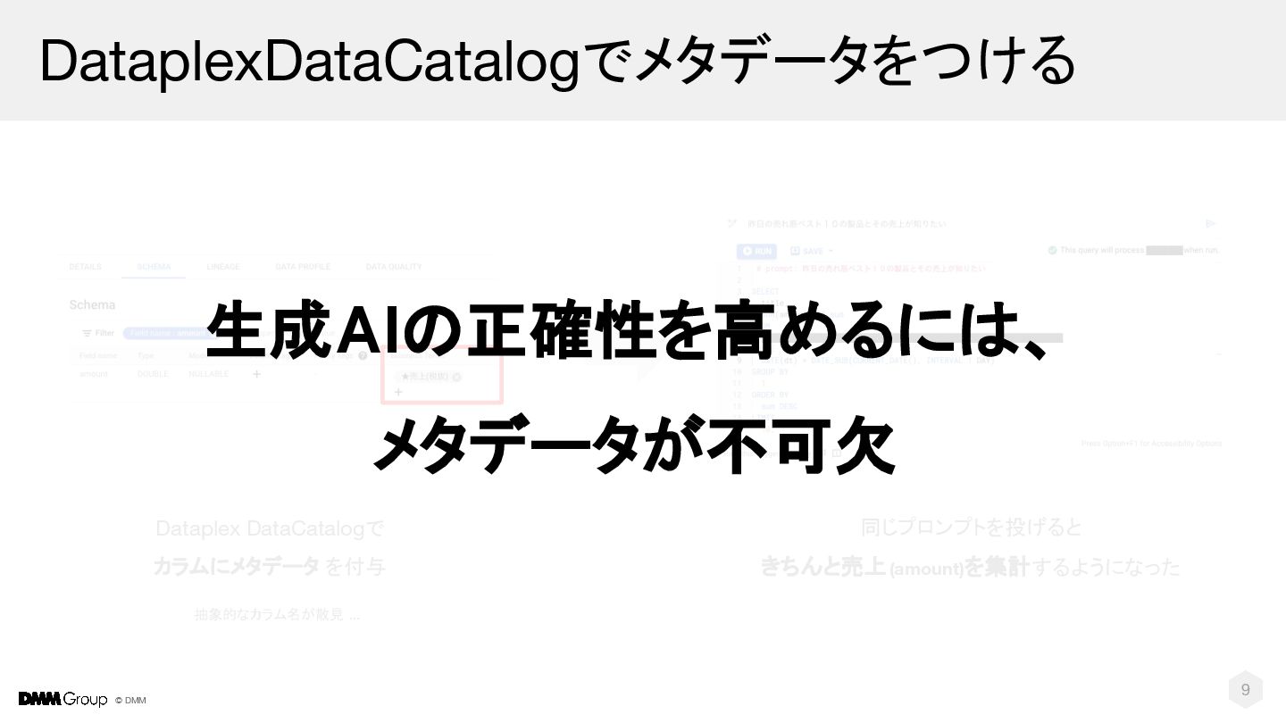 © DMM DataplexDataCatalogでメタデータをつける 8 同じプロンプトを投げると きちんと売上(amount)を集計するようになった Dataplex DataCatalogで カラムにメタデータ を付与