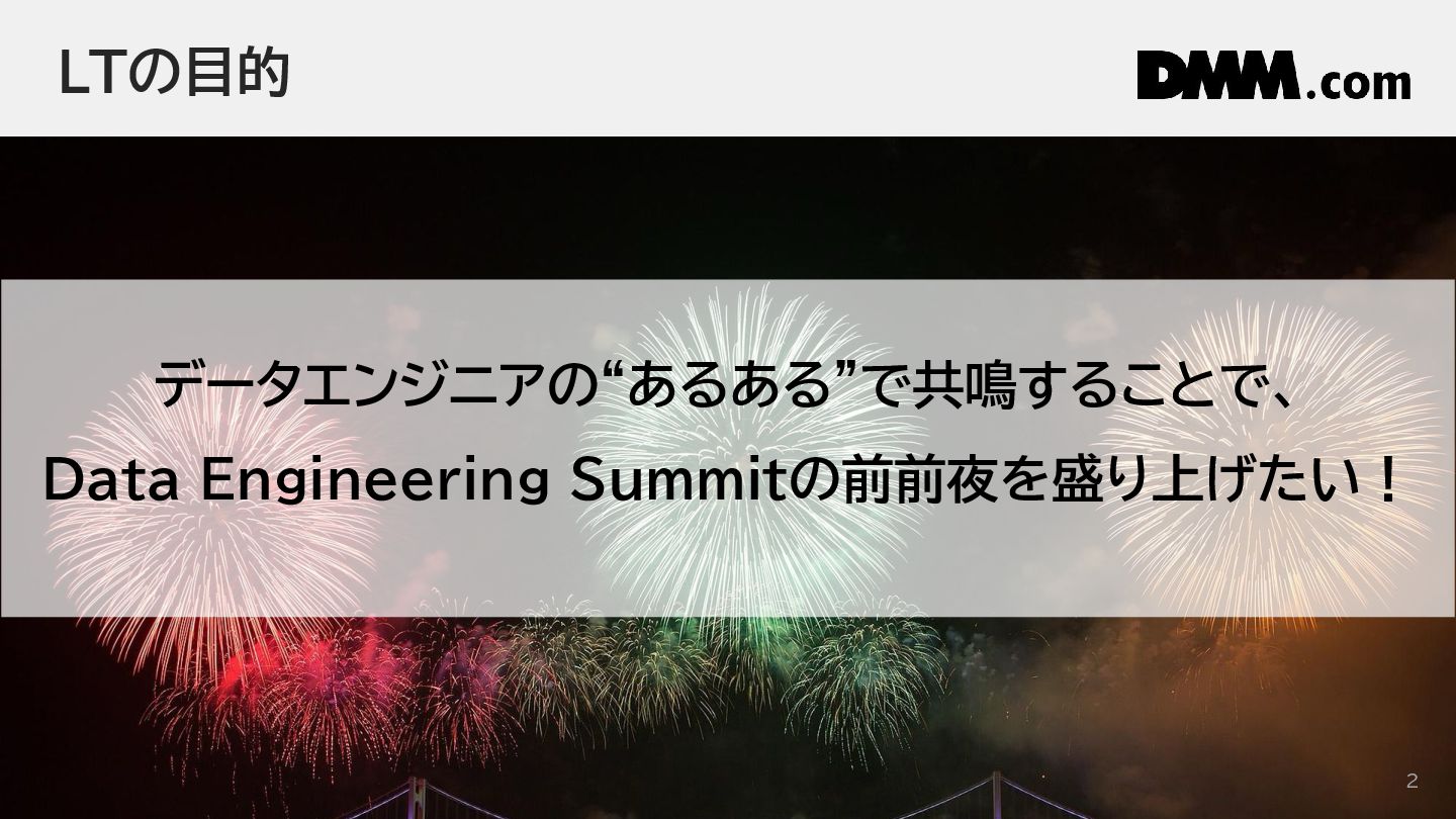 © DMM.com LTの目的 2 データエンジニアの“あるある”で共鳴することで、 Data Engineering Summitの前前夜を盛り上げたい!