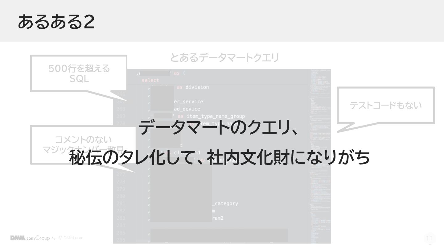 © DMM.com 11 あるある2 500行を超える SQL コメントのない マジックナンバー散見 とあるデータマートクエリ テストコードもない