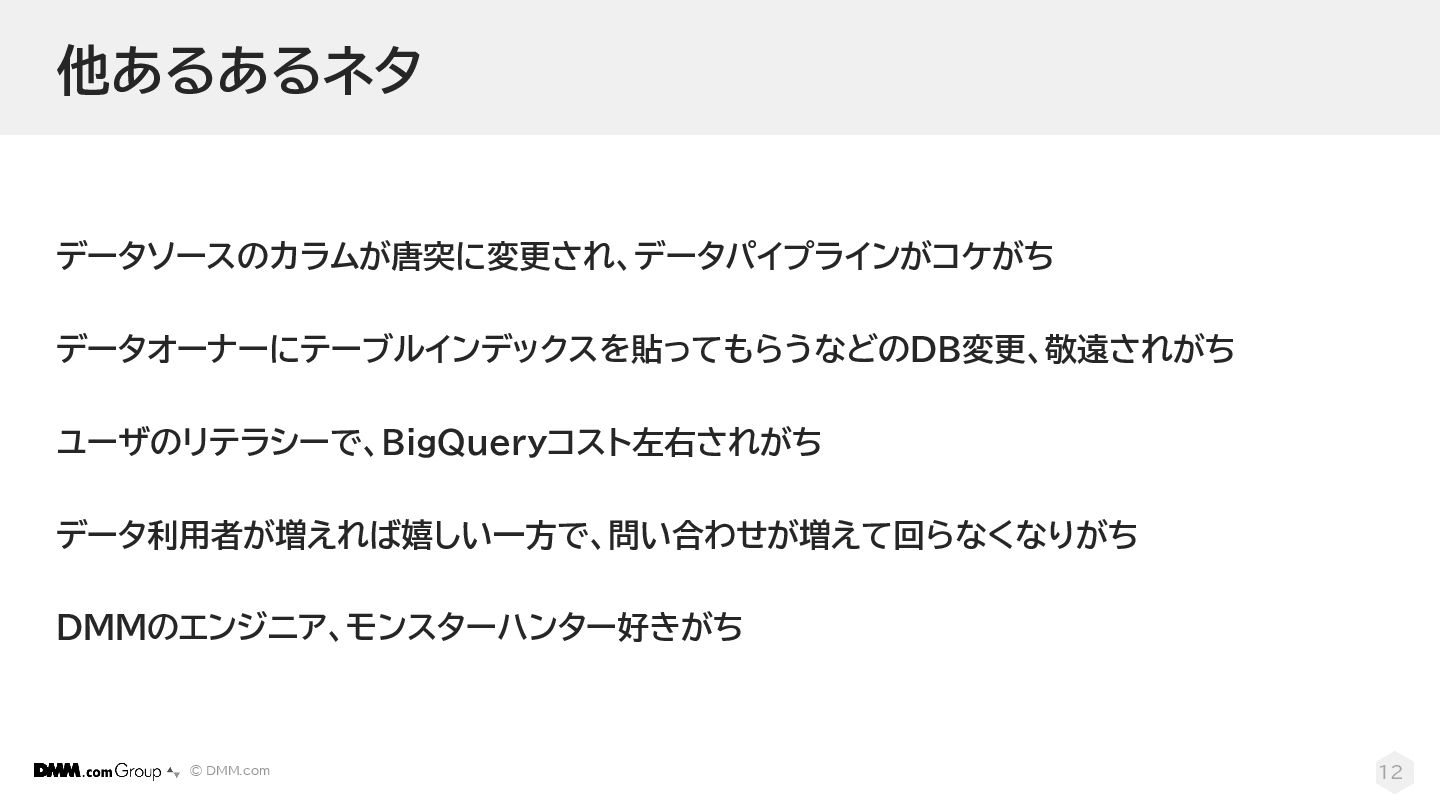 © DMM.com 他あるあるネタ データソースのカラムが唐突に変更され、データパイプラインがコケがち データオーナーにテーブルインデックスを貼ってもらうなどのDB変更、敬遠されがち ユーザのリテラシーで、BigQueryコスト左右されがち データ利用者が増えれば嬉しい一方で、問い合わせが増えて回らなくなりがち DMMのエンジニア、モンスターハンター好きがち 12