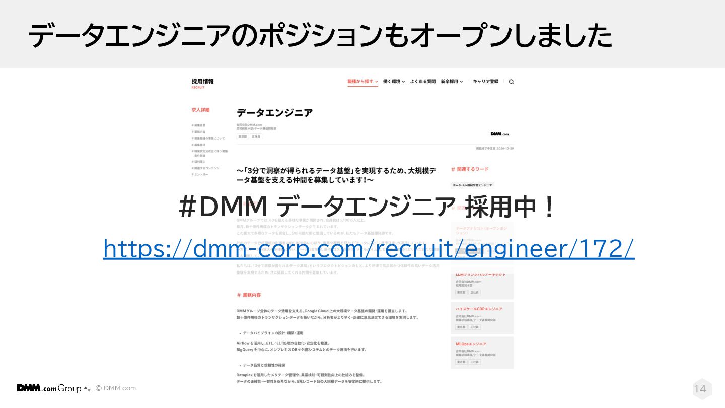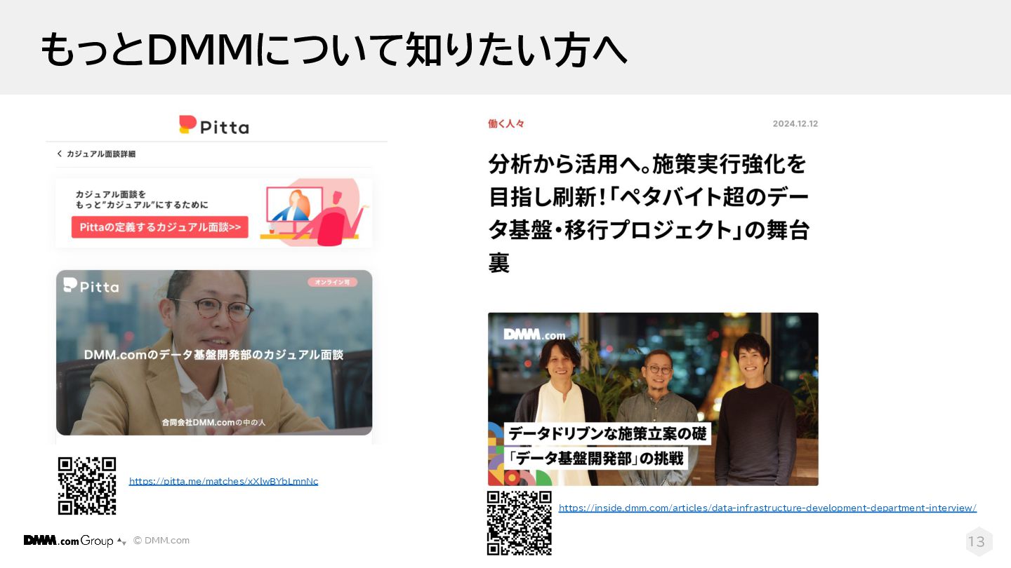 © DMM.com もっとDMMについて知りたい方へ 13 https://pitta.me/matches/xXlwBYbLmnNc https://inside.dmm.com/articles/data-infrastructure-development-department-interview/