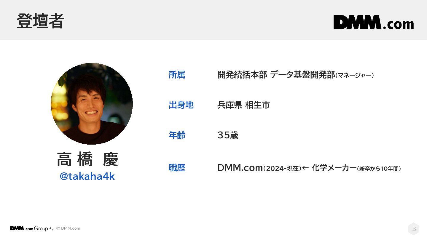 © DMM.com 登壇者 3 高 橋 慶 @takaha4k 所属 開発統括本部 データ基盤開発部(マネージャー)