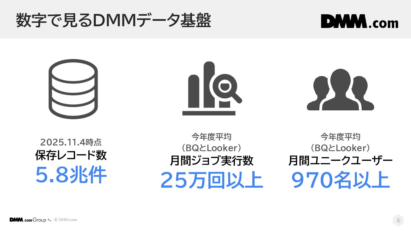 © DMM.com 数字で見るDMMデータ基盤 6 2025.11.4時点 保存レコード数 5.8兆件 今年度平均 (BQとLooker) 月間ジョブ実行数
