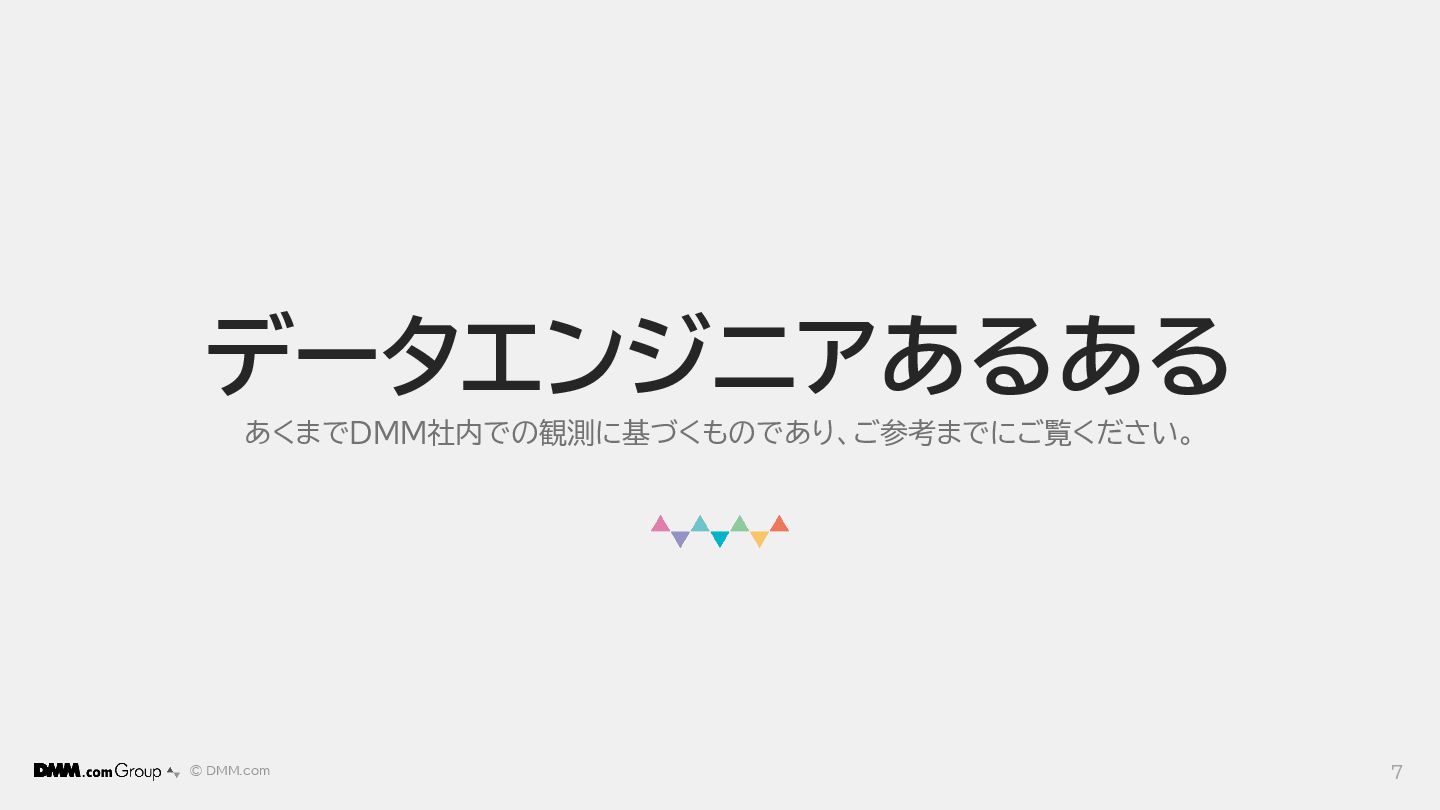 © DMM.com データエンジニアあるある あくまでDMM社内での観測に基づくものであり、ご参考までにご覧ください。 7